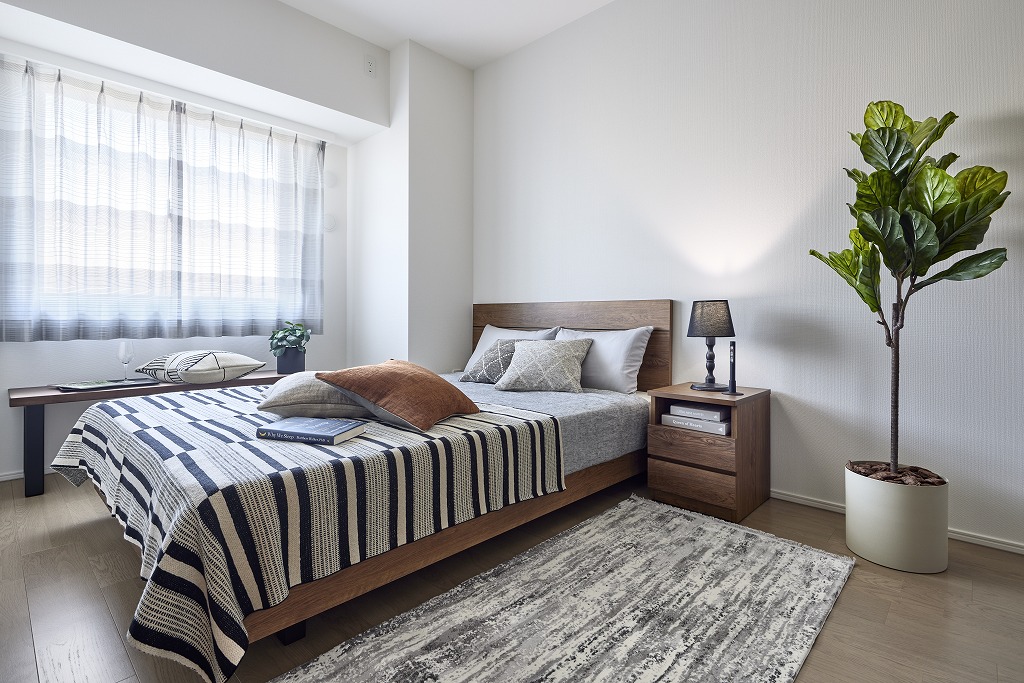 ナチュラルテイストの内装に、落ち着いたカラーでコーディネートした DINKSを想定したインテリア。