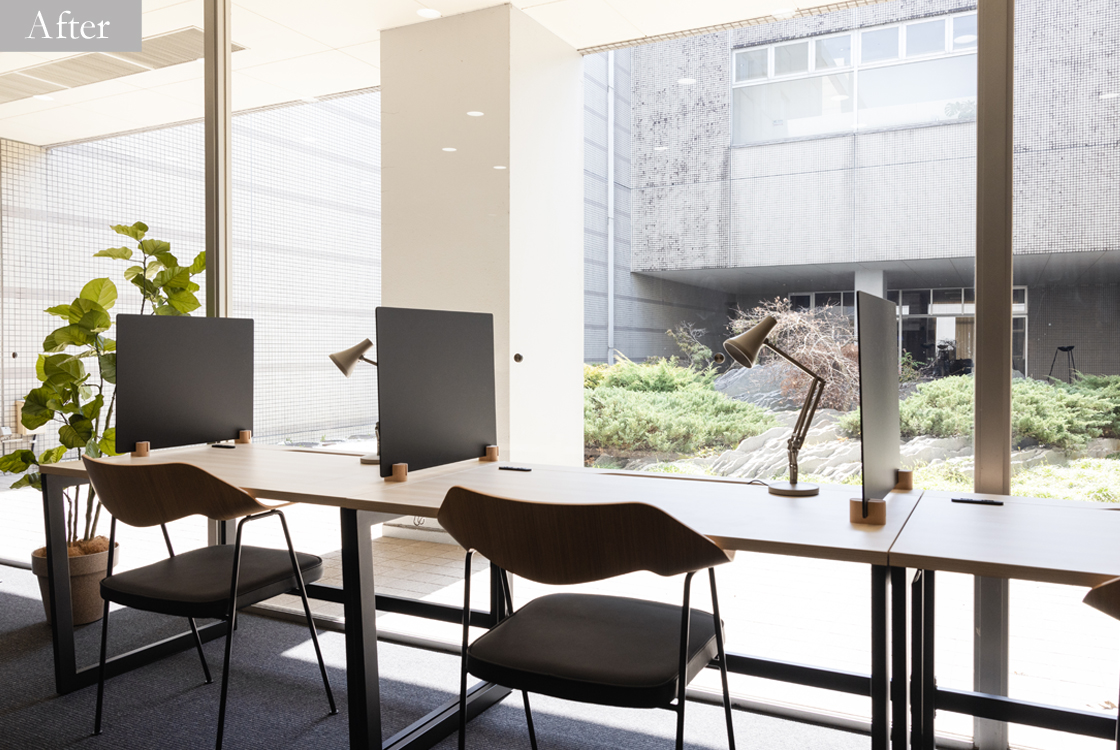内装は既存のまま利用し、和のしつらえに合うデスクとチェアを選びました。デスクとして選んだOWN-Sダイニングテーブル<ACTUS>は奥行きがコンパクトであるため、2台のデスクを向かい合せてワークショップなどグループ分けをするようなシーンでも利用が可能です。