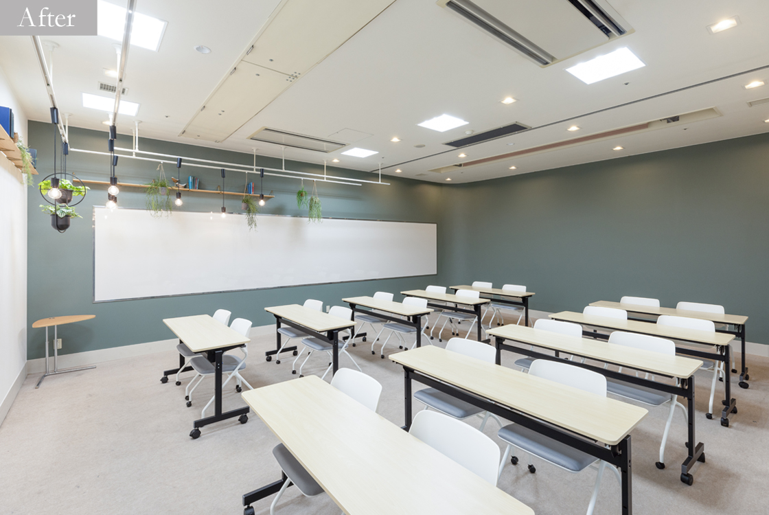 壁の半分を印象的なグリーンのクロスに変更する事によってお部屋に入った時の印象を大きく変え、もう半分はプロジェクター投影用のクロスに変更。壁面には大きなホワイトボードも設置しています。