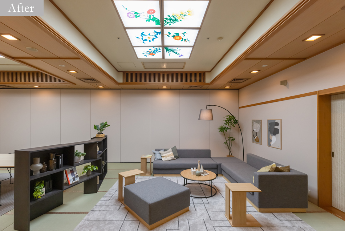 空間の一面にラグを敷き、襖の一部や障子を変更することでコストを抑えつつもオフィスとして利用しやすい空間に変化させました。