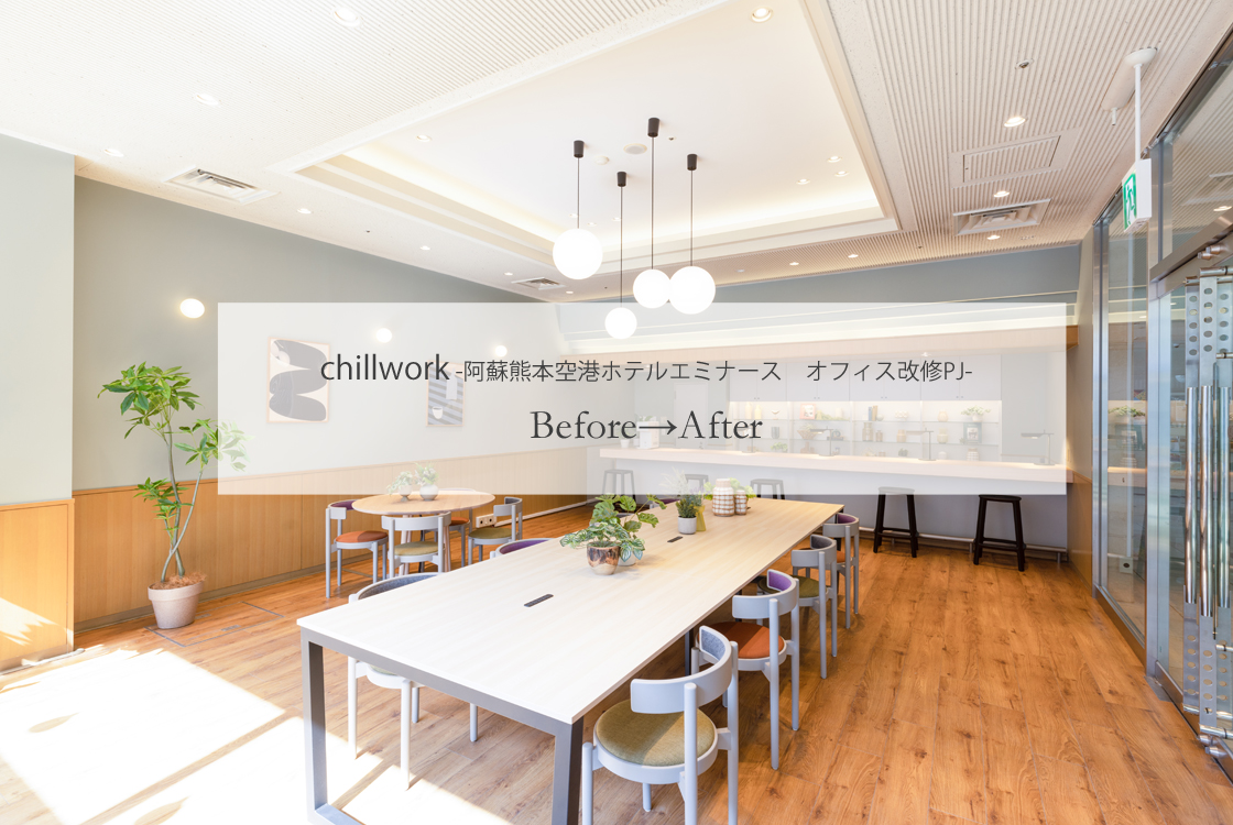 阿蘇熊本空港ホテル エミナース様の新たなオフィス事業”chillwork(チルワーク)”において、内装のリノベーションとFFEを担当いたしました。