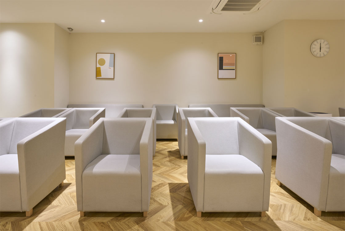 待合室は、はっきりとしたカラーを使わず、木の温もりをベースに、