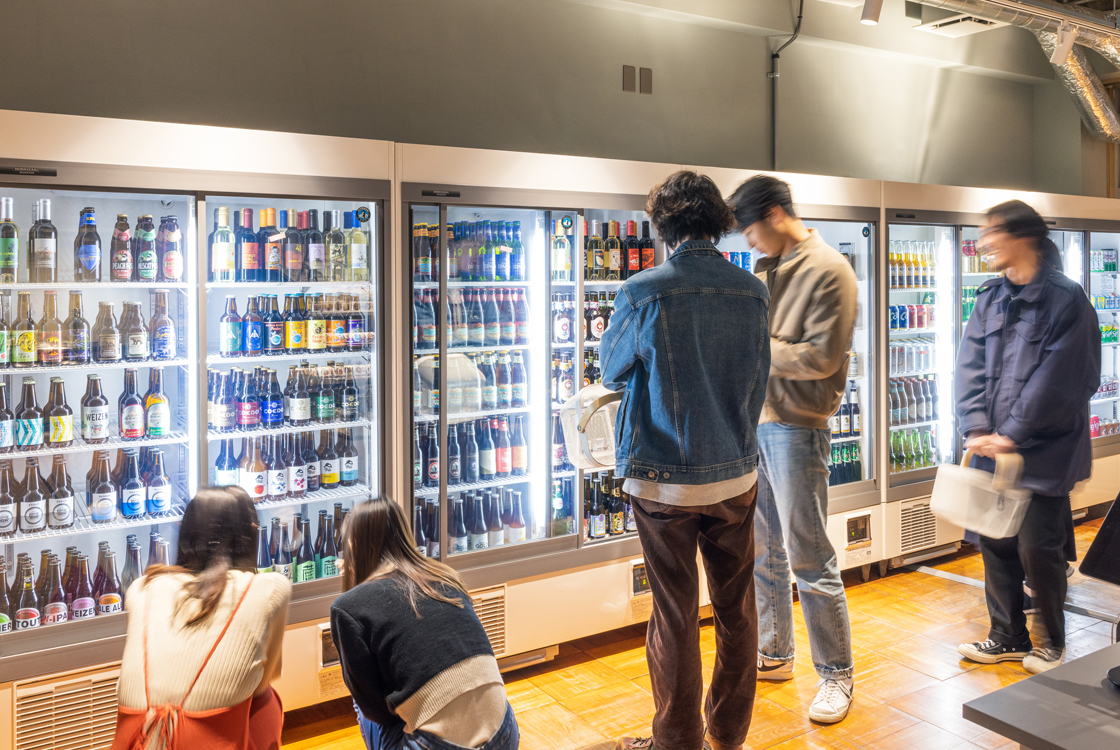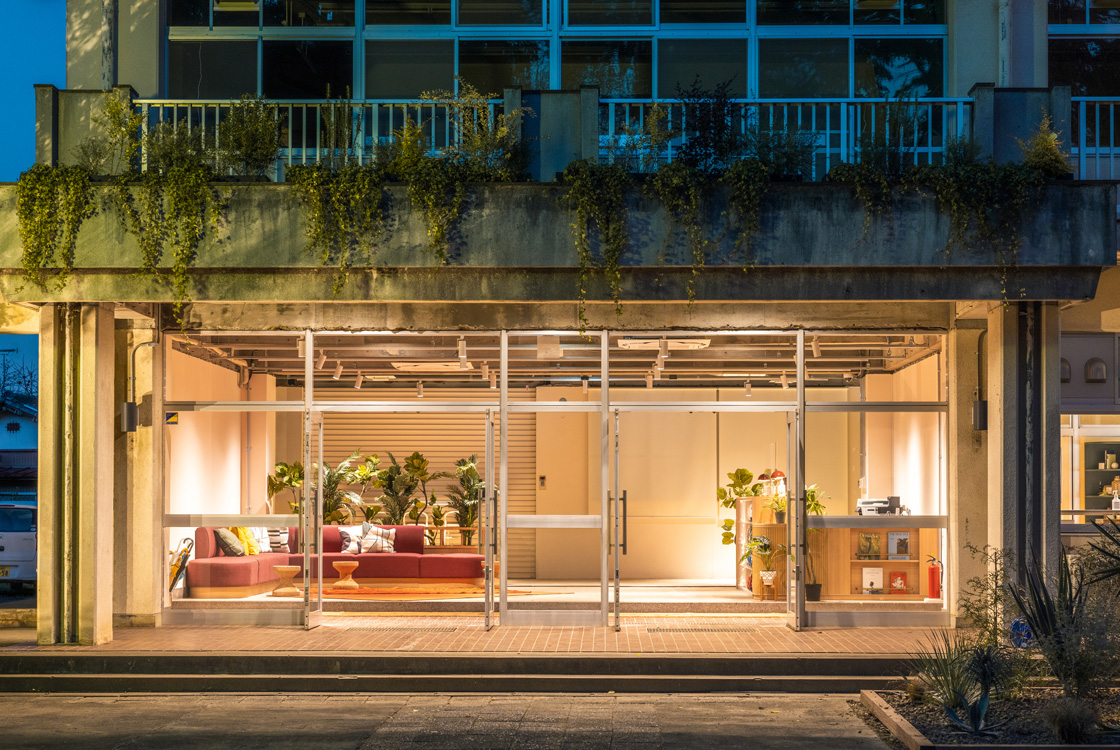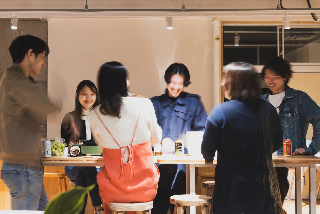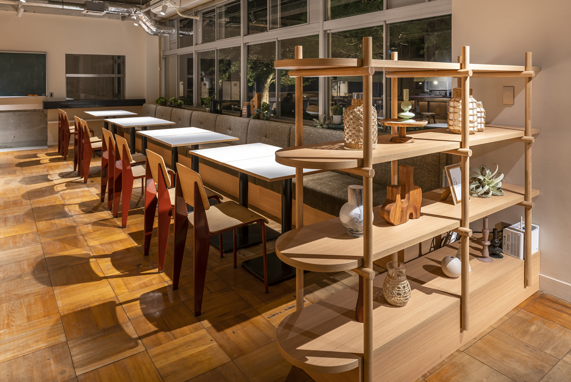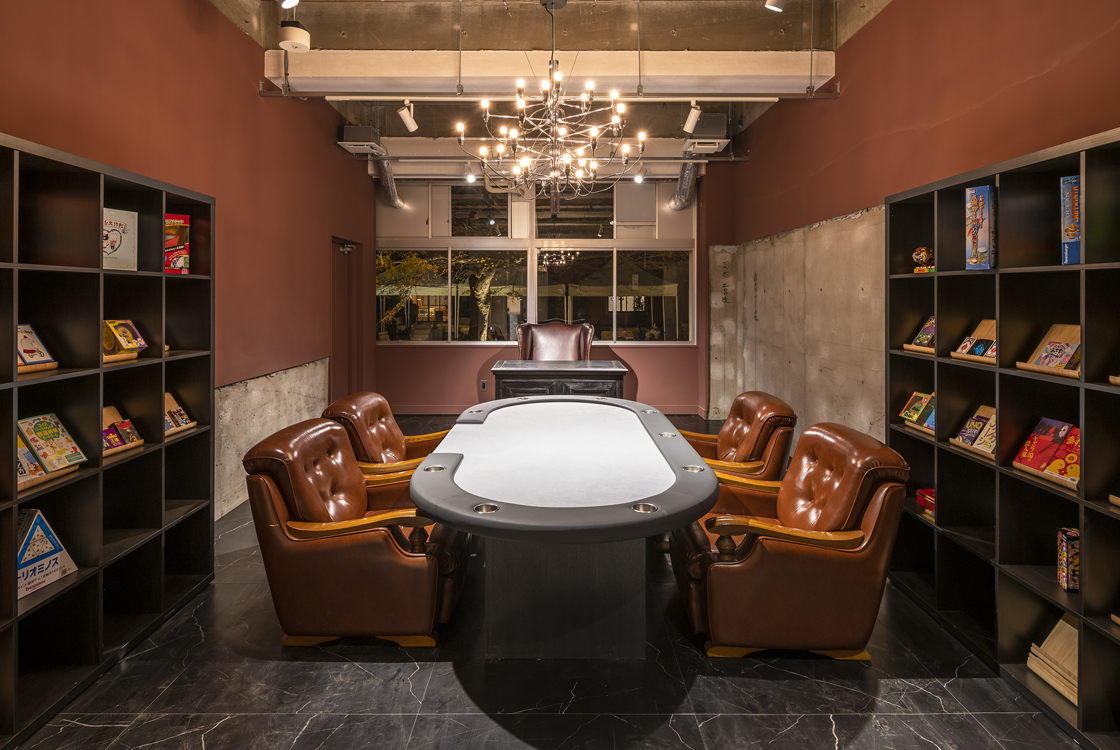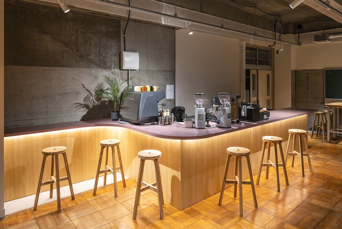 共用棟には宿泊者以外の方でも利用できるカフェを併設しており、レイアウトを自由に変えられる可動式のハイテーブルを特注で製作し、見知らぬ人同士でも交流しやすい空間づくりを意識しています。