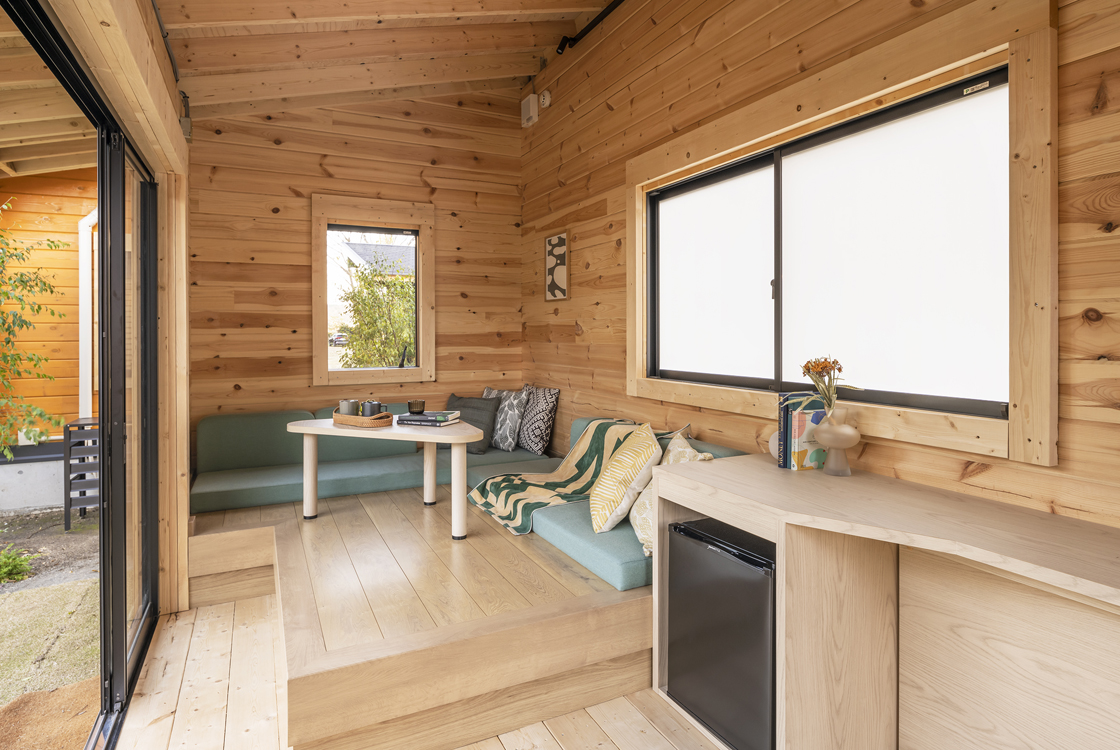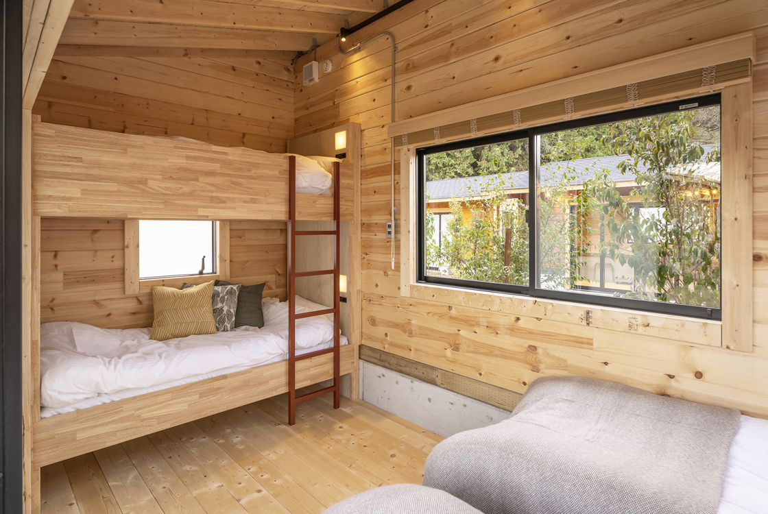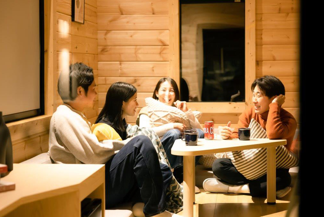 宿泊棟の4人棟では、2つのロッジのうちの片方をリビング棟として、もう片方を寝室棟として、それぞれの機能を1つのロッジに集約する事で時間を気にせずグループで会話を楽しめる空間にしています。