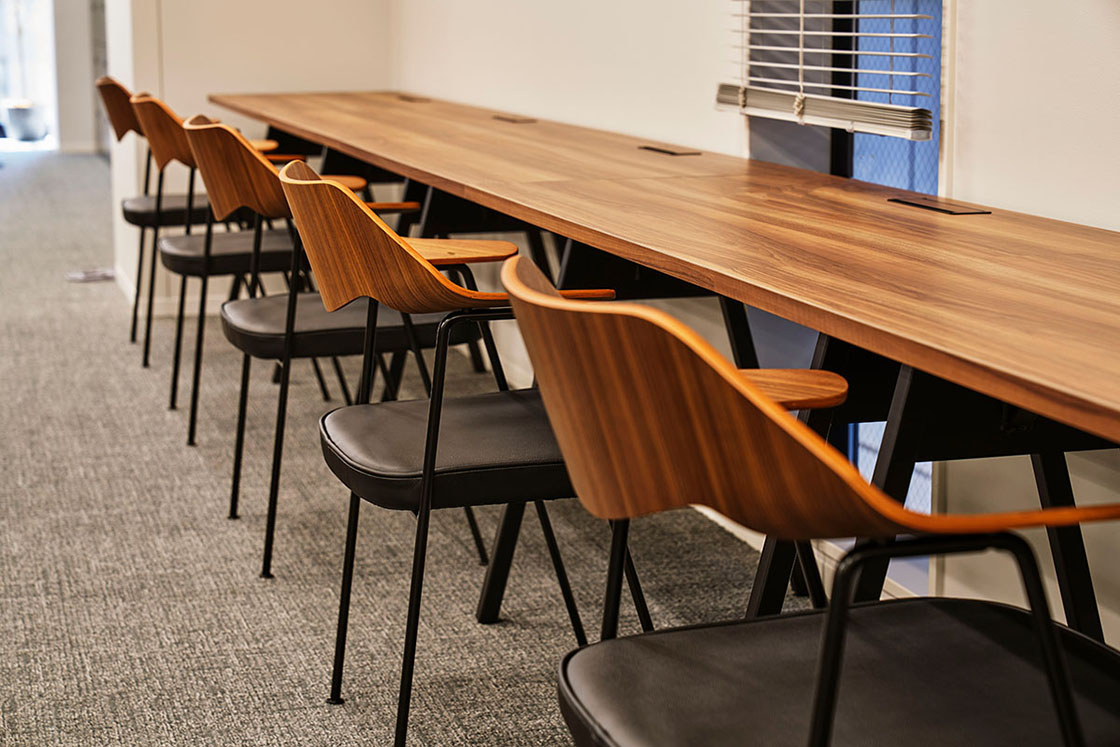 エントランスからガラスの間仕切りで見通せるフリースペース(14席)には、個人邸でも使われるウォールナット無垢材のダイニングテーブルに、特徴的な形で見た目で印象にも残りやすいチェア2種をセレクト。壁に面したカウンター席のイスにも、曲線と木目を生かしたデザイナーズチェアを選びました。