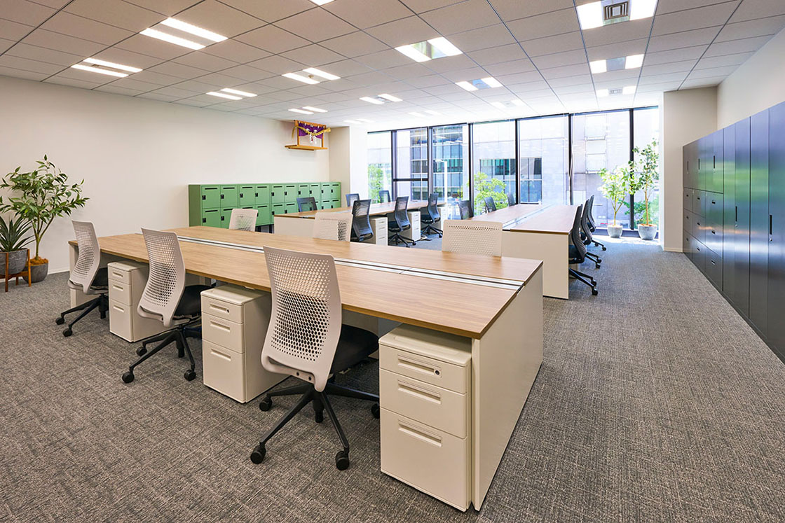 オフィス執務スペースは、窓の外の木々を借景に18席を配置。木目調の天板と白色のキャビネットというナチュラルな配色のデスクに、座り心地に定評のあるワーキングチェアをコーディネート。チェアは2つの色を採用しています。また、個人ロッカーは高さが125cmと低めで、かつ脚付きタイプを選ぶことで、軽快な雰囲気に。オリーブグリーンという借景に合わせたカラーもポイントです。さらにアクタスでは、グリーンもご提案できることから、オフィスの雰囲気に合った、メンテナンスのしやすいフェイクグリーンと植木鉢やスタンドを組み合わせて、寛げる空間を演出いたしました。