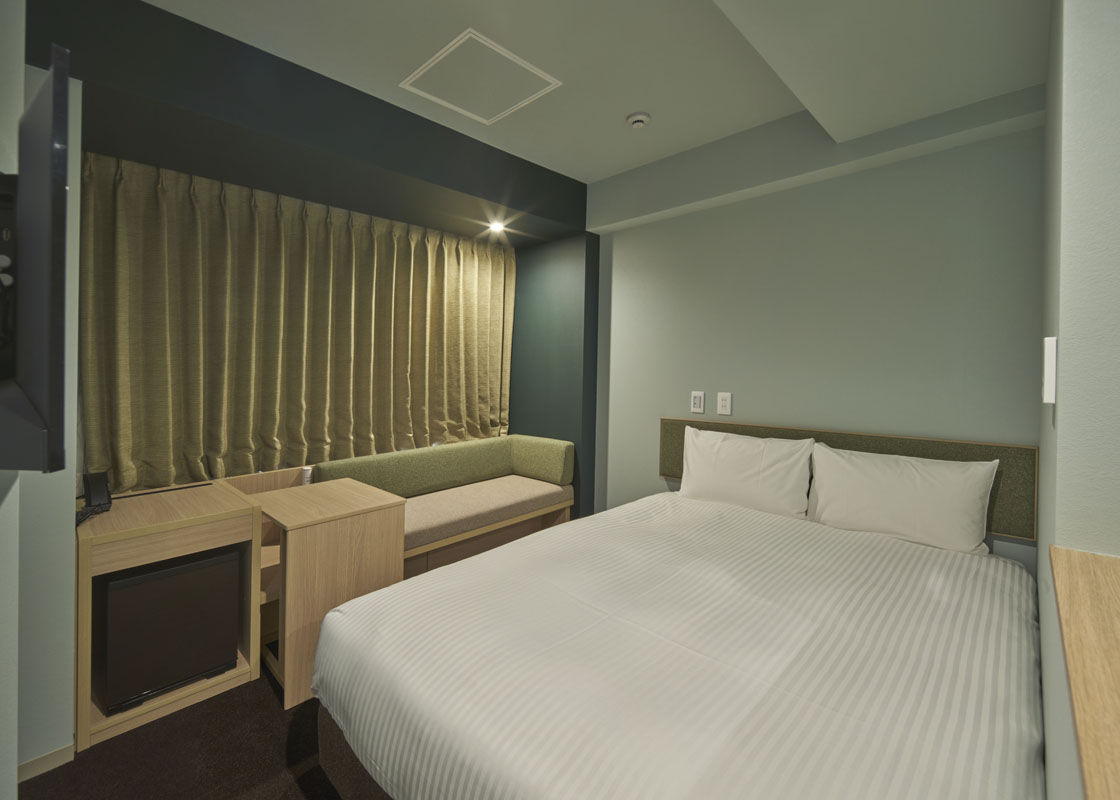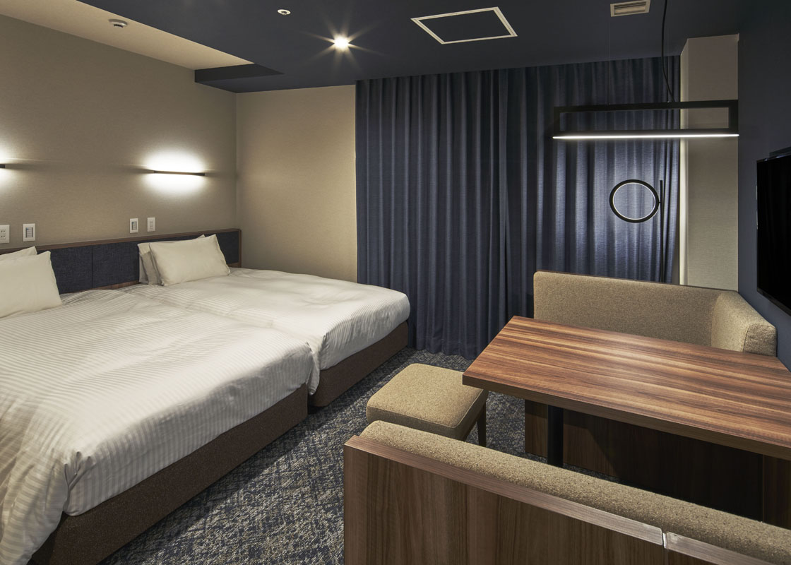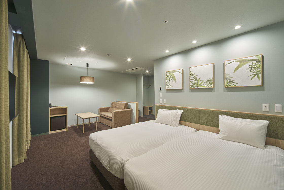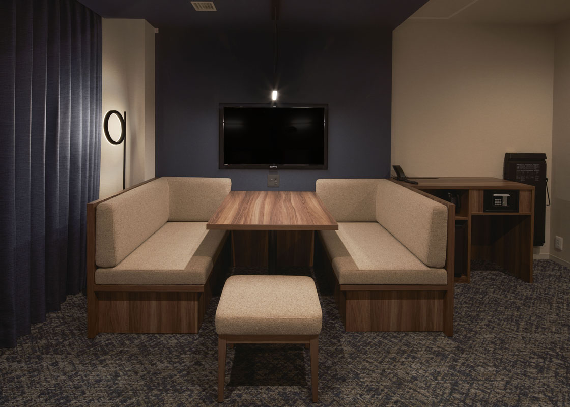 カンファレンスとホテルが融合したカンファレンスホテルの客室として、研修後の時間も自分と向き合い過ごせる客室と、研修に参加した仲間と交流できる客室を目指しました。施設にある中庭の水景と植栽から「水」=個、「緑」=協と定義し、シングルルーム2タイプ、ツインルーム、デラックスツインルームのカラースキーム、レイアウトプラン、客室FFEをアクタスが担当しました。