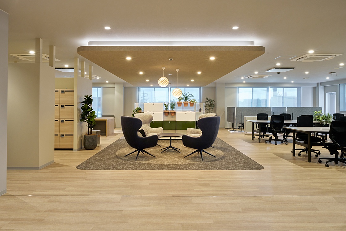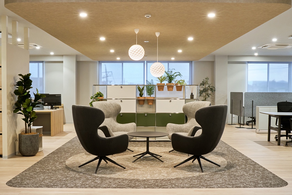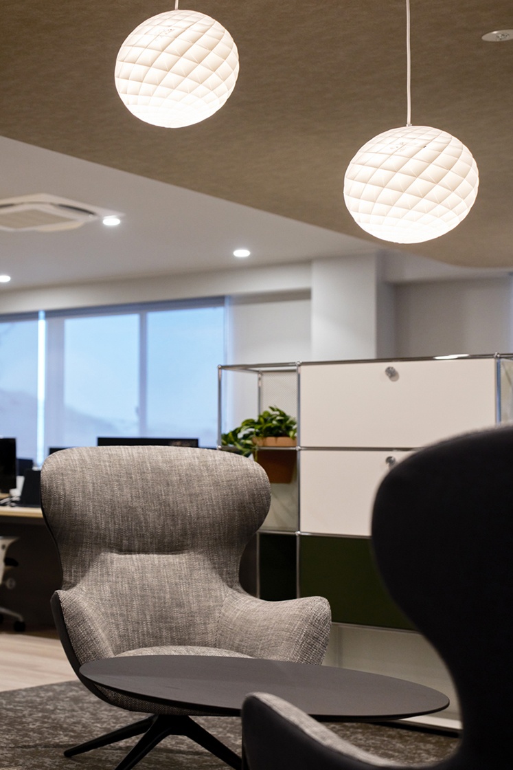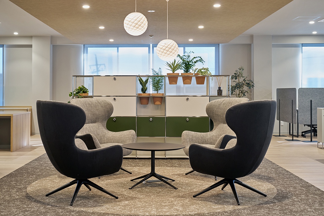 家具はイタリアのハイエンドブランド、ポリフォームの一人掛け「MAD JOKER」を配置し、その優雅なデザインと座り心地の良さ、足触りの良いカーペットで、社員のコミュニケーションを促すような空間を提供しました。また、パーテーションとしての役割も果たす収納家具「USMハラー」はオリーブ色をセレクトし 観葉植物をスタイリングすることで、リフレッシュも可能な象徴的な空間を演出しています。