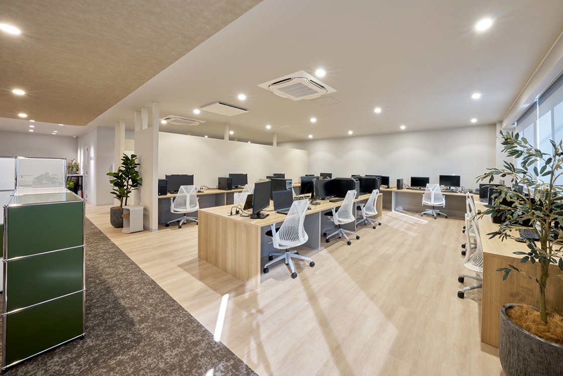 執務エリアは、主に設計担当の社員向けに、2台のPCモニターを備えた広めの作業席、大きなテーブルを向かい合って座る執務席、そしてパーテーションで区切ったリモート会議個人席で構成しています。