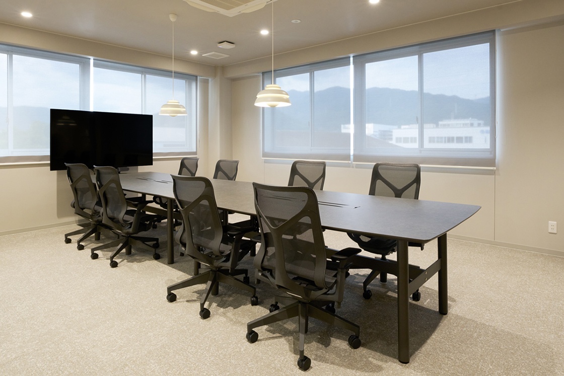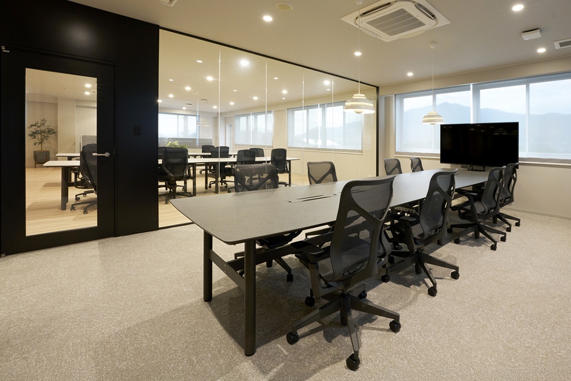 長時間の作業を支えるため、チェアにはハーマンミラーの「SAYL CHAIR」やウィルクハーンの「IN CHAIR」といった高機能を導入。また、ガラス張りで開放感のある大会議室は、8人が座れる大きなテーブルを配置し、シンプルなレイアウトにしました。