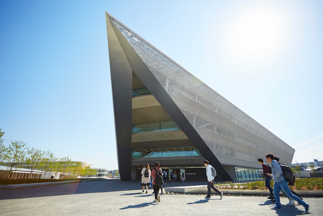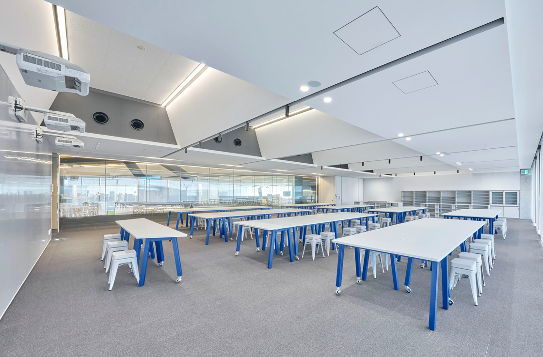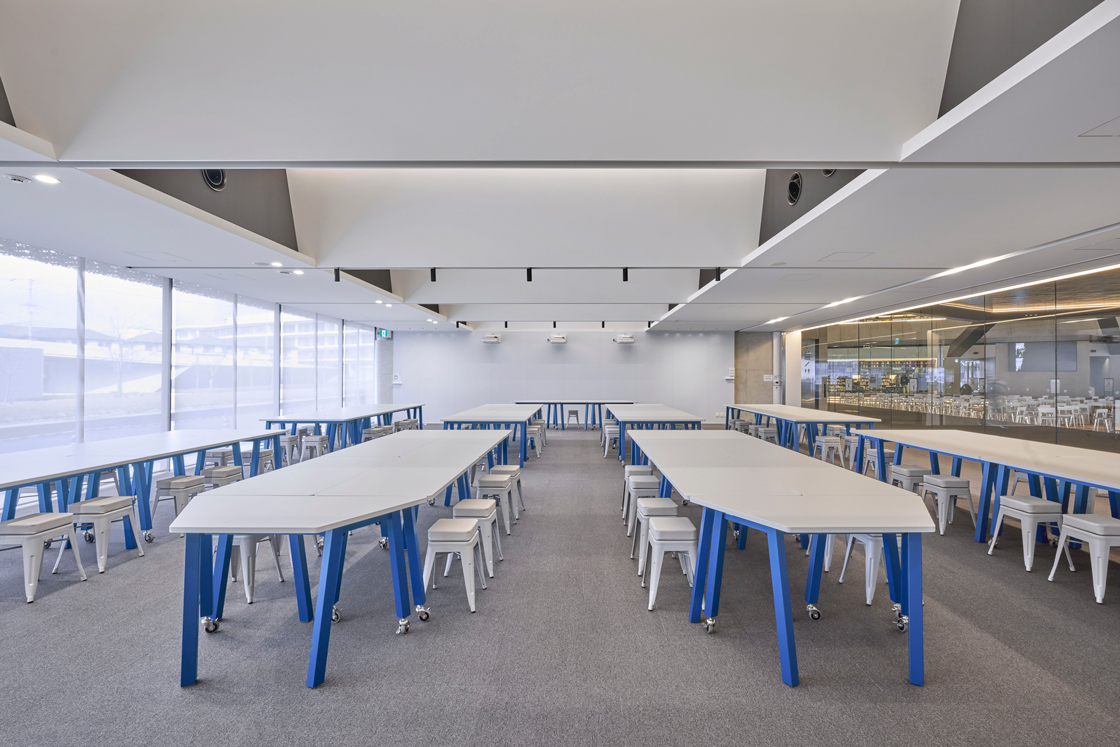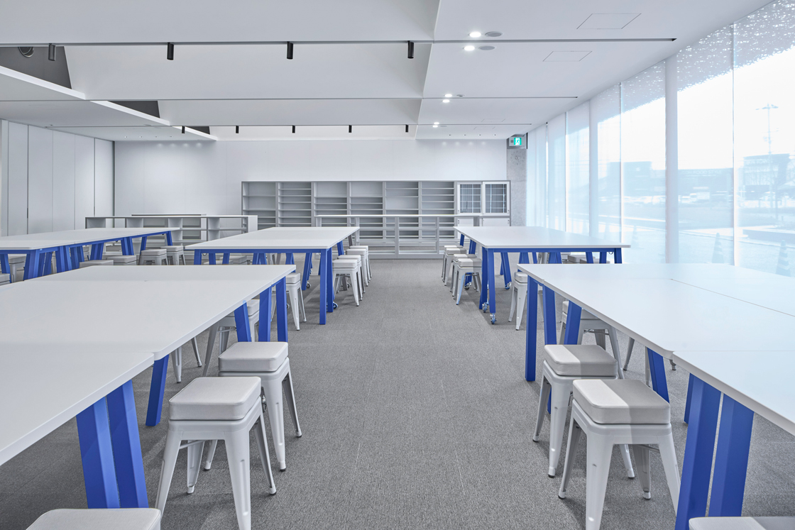 実験室は2019年に完成した校舎の一階に位置し、大学側からは、三つの要望をいただきました。一つ目は、オリジナルの什器で新しさや、オリジナリティを出したい。二つ目は、実験室をフレキシブルにレイアウトできるようにしたい。三つ目は、スクールカラーのブルーを生かしたい。