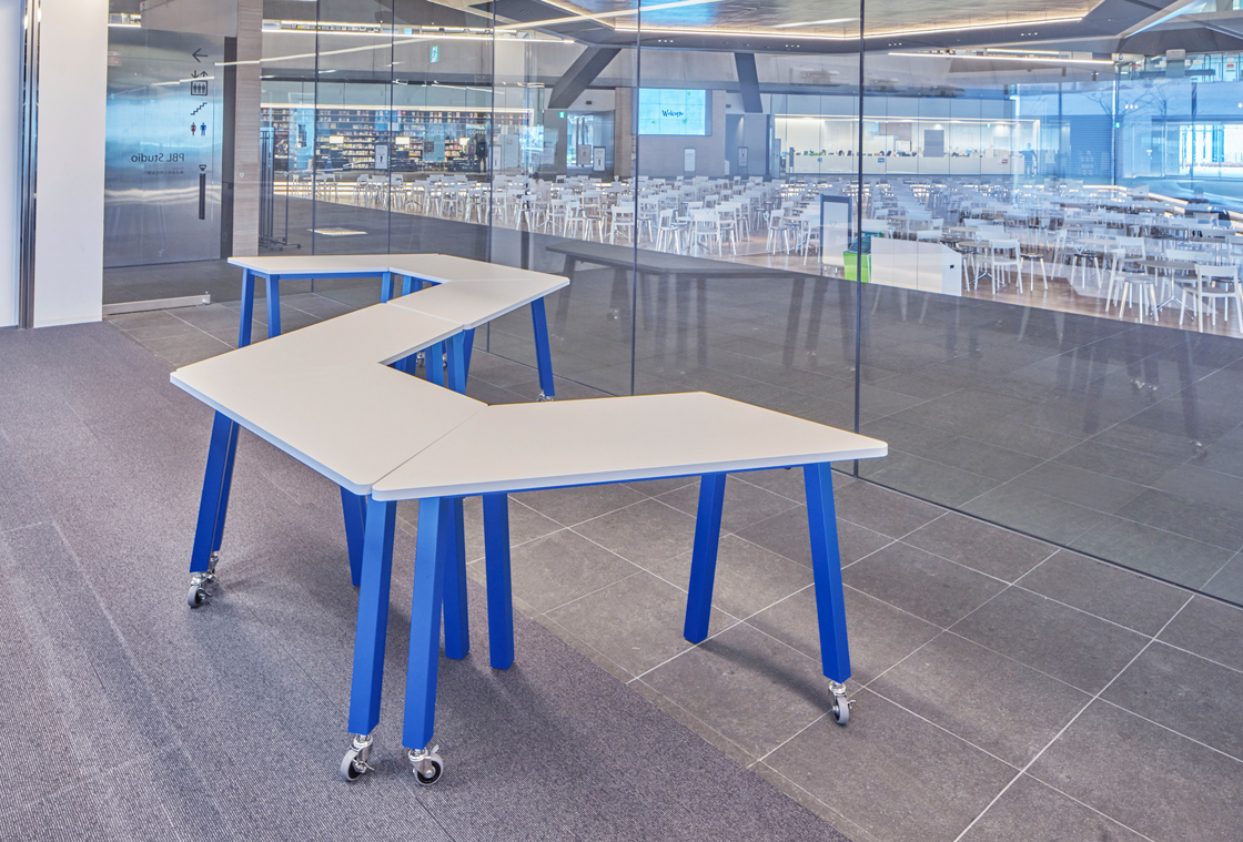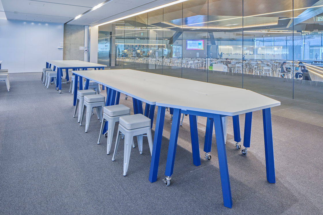 そこで、まずはテーブルを天板が長方形と台形の2種類をデザインして、直線のレイアウトのほか、ジグザグのようなレイアウトも可能にしました。テーブルの脚はハの字型で直線の空間に動きを出すとともに、スクールカラーのブルーを採り入れ、空間のアクセントとしました。また、実験は立って行うこともあるため、テーブルは高めに設計しています。