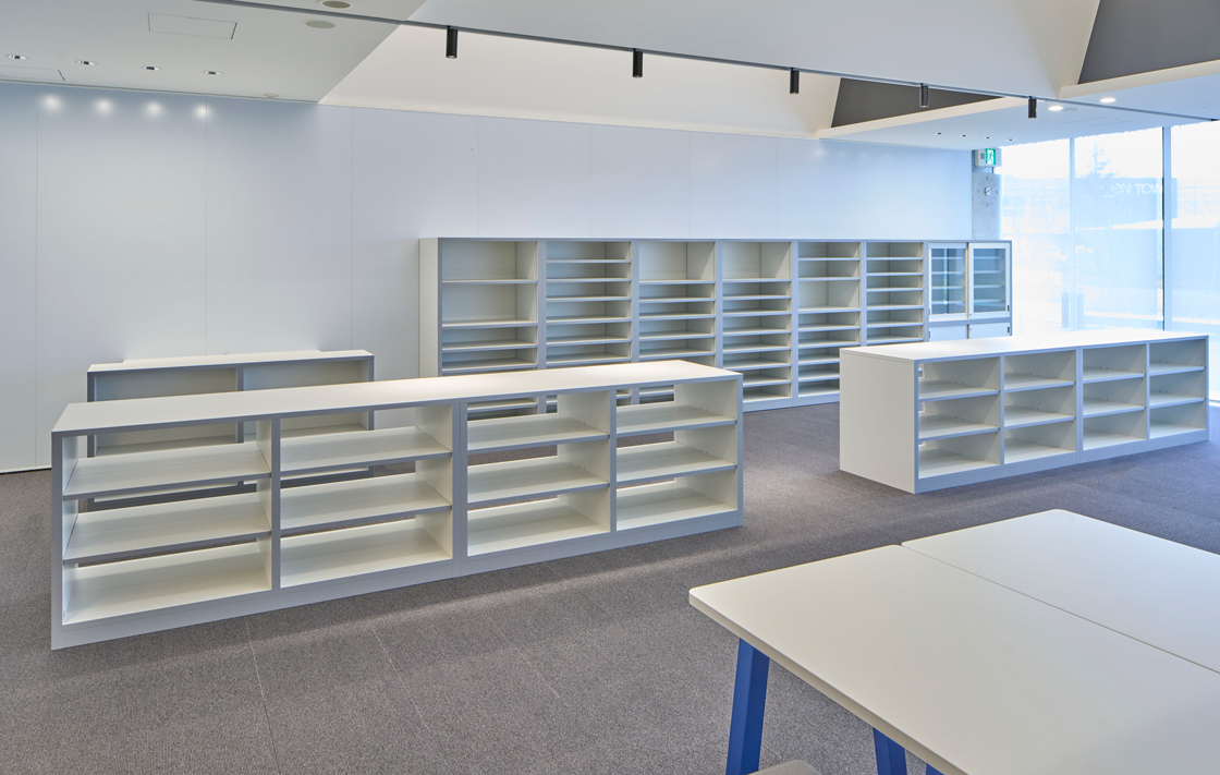 実験室の後方にある収納は、それぞれの実験器具に合わせたサイズに設計しました。テーブルと同じく白を基調としながらも、木口のみグレーカラーとして、床の色と調和するようにしています。