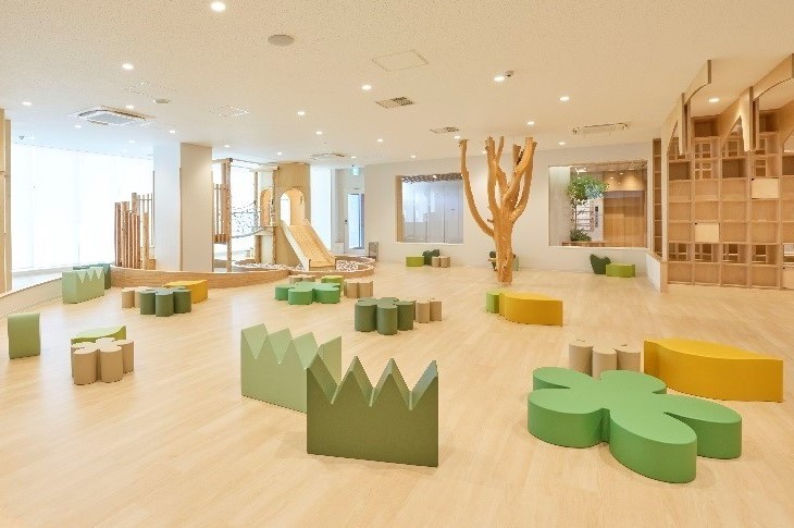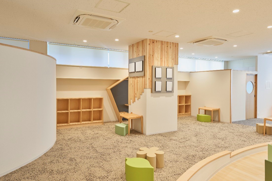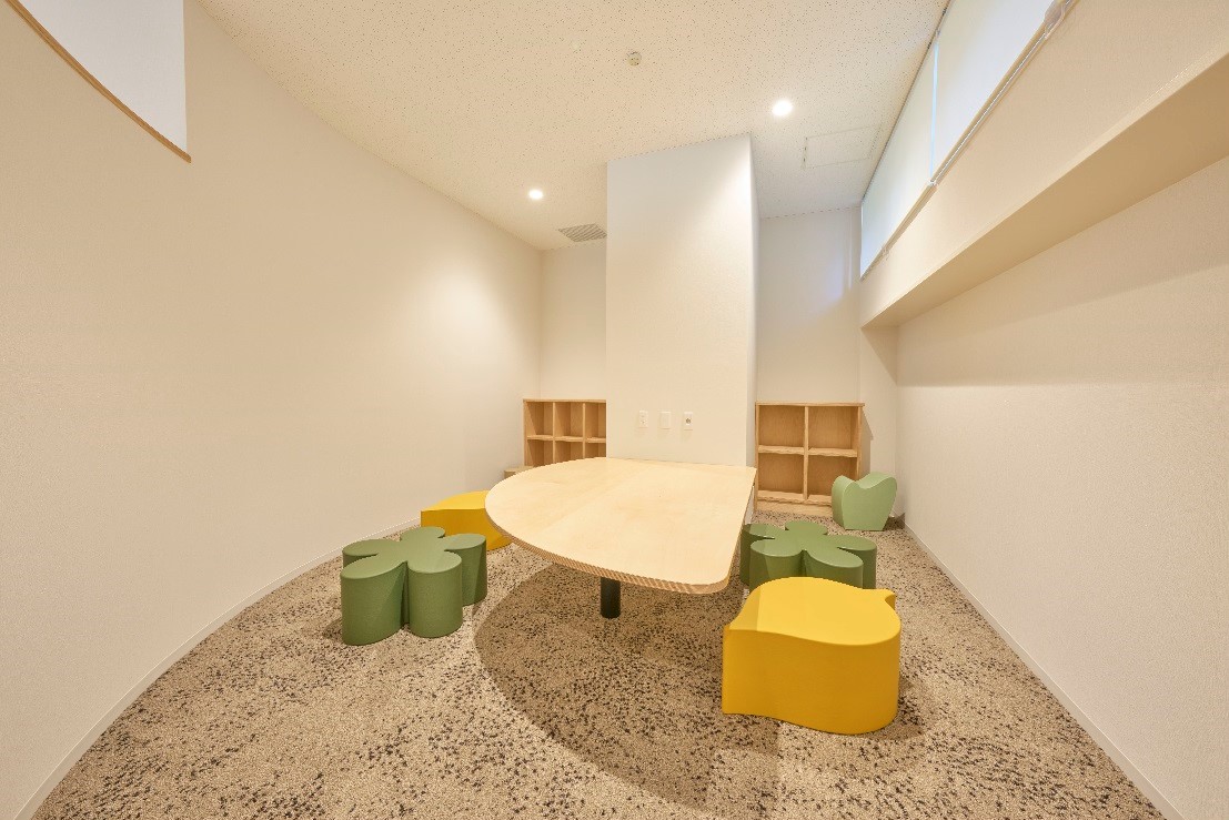 はいはいや、よちよち歩きを始めたお子さんも多く利用される施設であることから、家具は椅子として座ったり、テーブルとして使ったりもできる用途の広いモノをセレクトしました。ソフトな触感のポリウレタンフォームを、しっかりとした塗膜でコーティングした、安全性と耐久性の高い家具です。花びらや葉っぱ、草むらをモチーフにしているので、室内でありながらも、まるで外の公園にいるかのように感じられるような楽しい空間になりました。授乳室や面談室も同じアイテムでコーディネートしています。