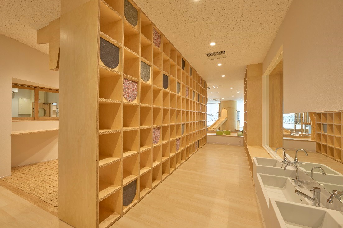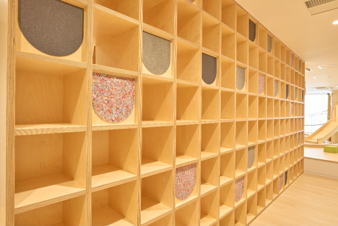 造作の靴箱には、リサイクル繊維を使ったパネルをあしらいました。表情豊かな雰囲気と、子どもたちが自分の靴をどの場所にしまったかを覚えやすくすることを意識しました。