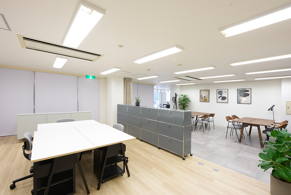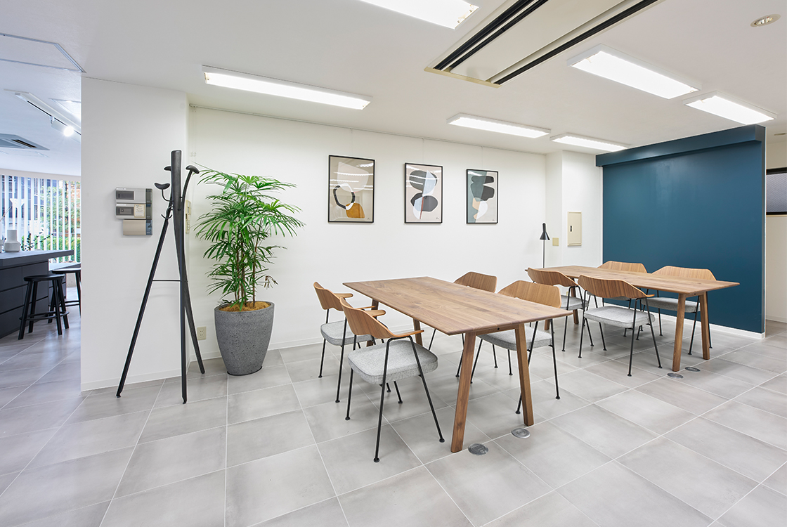 空間は、 商品の魅力を分かりやすく見せるショールームとお客様と商談を行 うミーティングスペース、 事務作業を行うオフィスと大きく3エリアに区切り、内装計画から家具、 アートやディスプレイなどトータルでご提案しました。