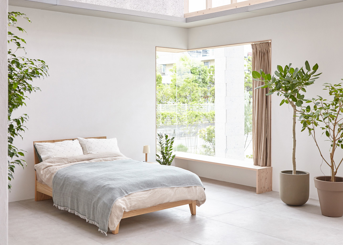 自然光が差し込む大開口があり、天井が高く間仕切りの少ない開放的な間取りで、主役となる被写体が映えるように、シンプルなデザインながら上質な素材感が感じられるような家具をセレクトしています。