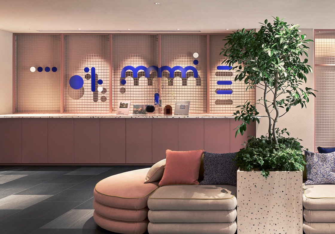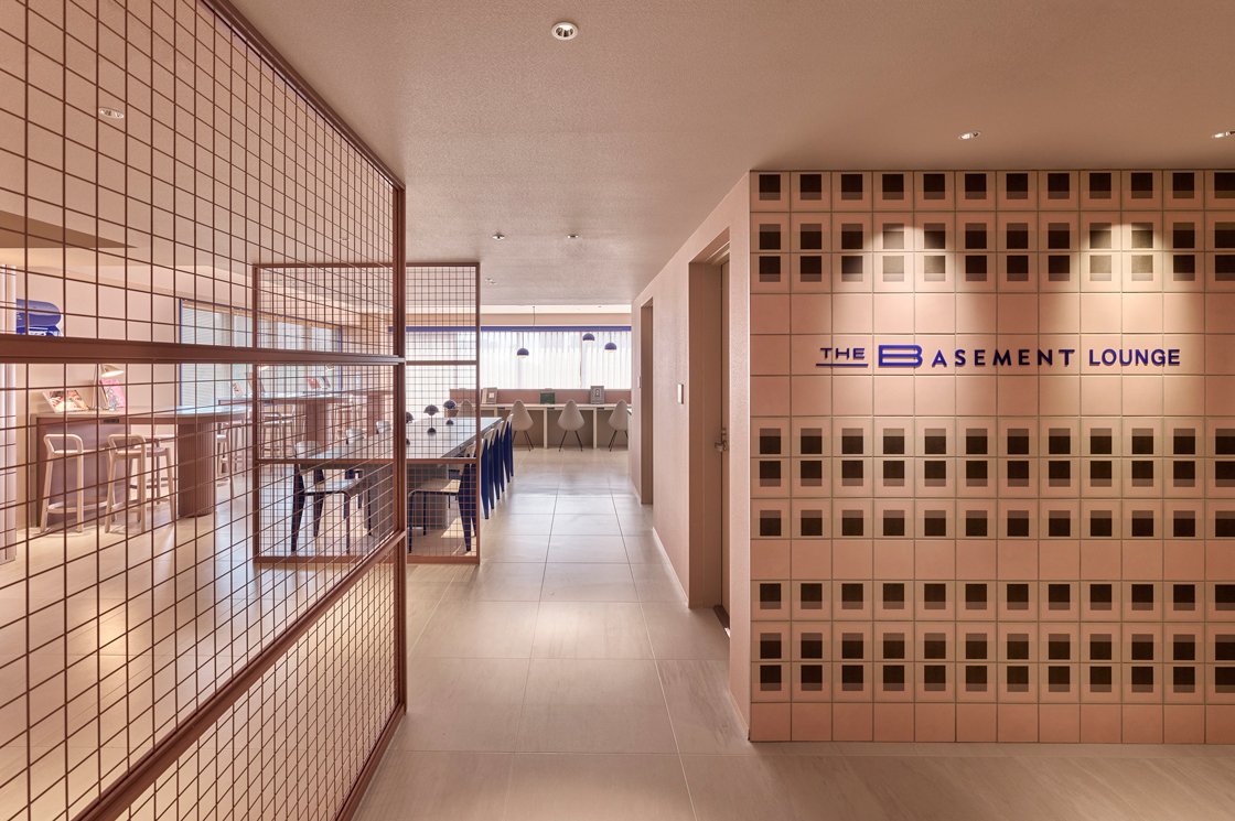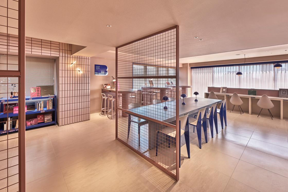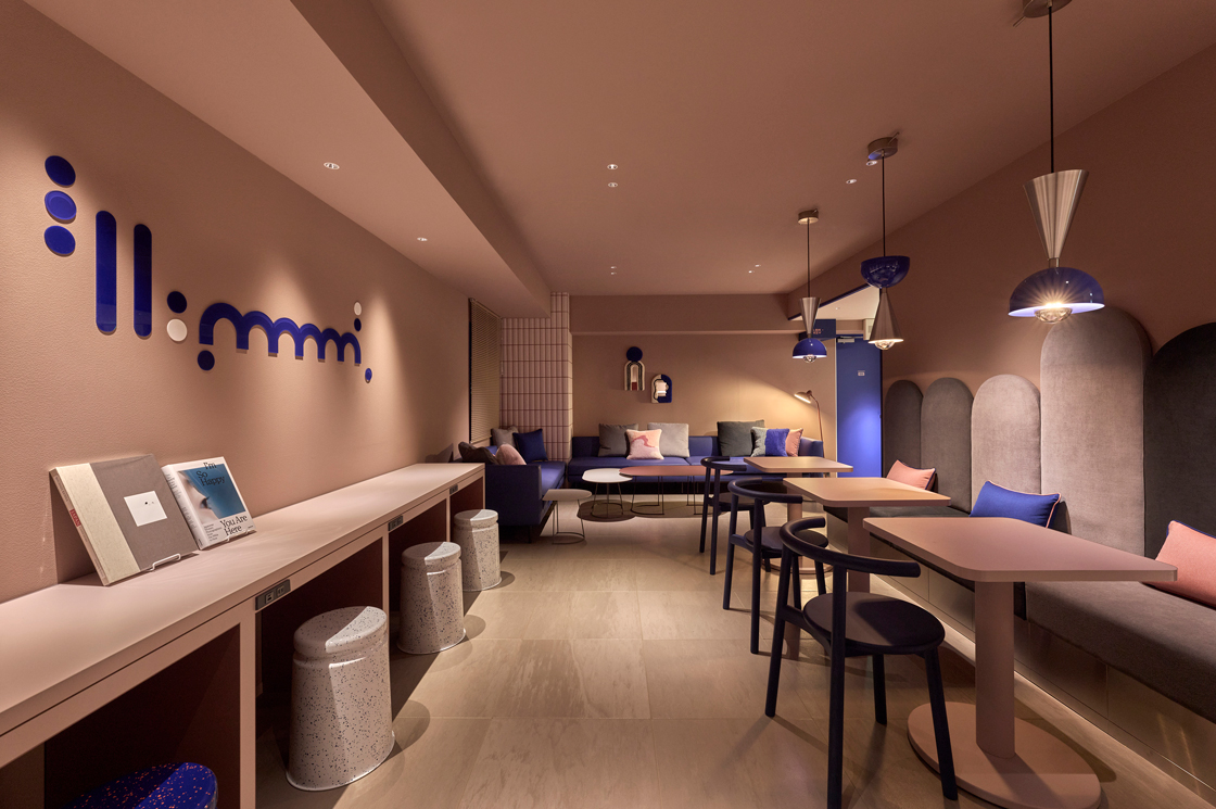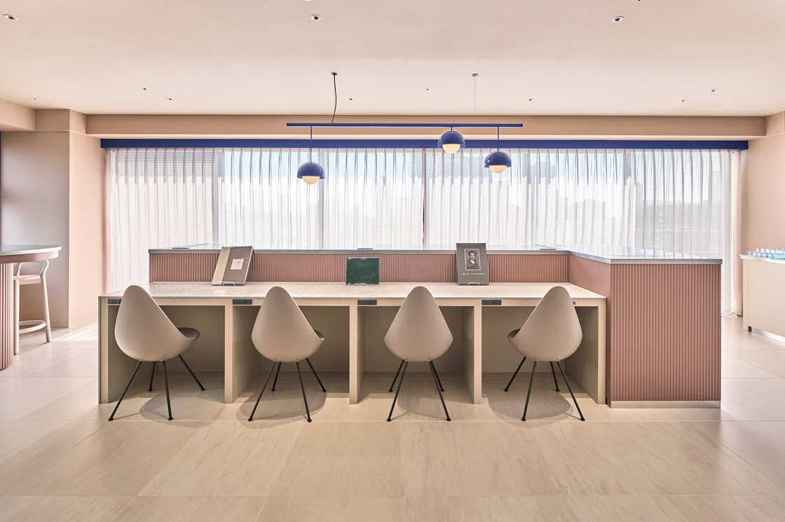 14階の共有スペース「THE BASEMENT LOUNGE」は、セルフサービスのイートインスタイルを採用。内装は、ピンクとブルーを基調に、エリアごとに造作のテーブルやソファを配置し、デザイナーズチェアやオリジナルの照明を取り入れています。目を引くサインも各所に設置。一人でも大人数でも、それぞれのスタイルで過ごせるように、テーブル席、カウンター席、ラウンジ席を設け、エリアごとに変化を持たせた設計としました。宿泊客同士のコミュニケーションが生まれることも考慮したソーシャルなエリアです。