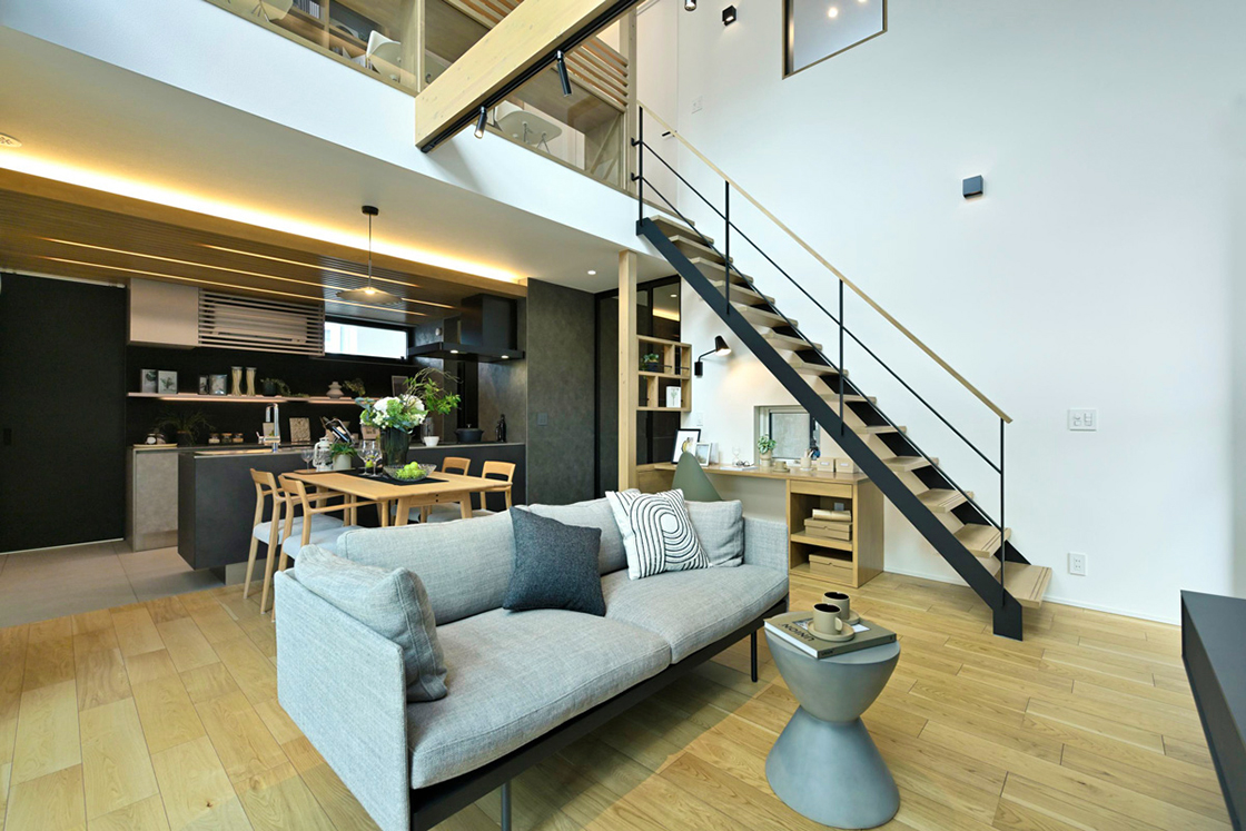 2階建てのモデルハウスは、最新の蓄電システムや断熱仕様を搭載した次世代型です。家族が集まるリビング・ダイニングは、吹き抜けのあるスクエアな空間で、白い壁とスチール製の黒い階段、木のフローリングという要素で構成されています。このソリッドで力強い内装に合わせて、「シンプルモダン」をテーマに、素材感のある家具と小物をコーディネートしました。