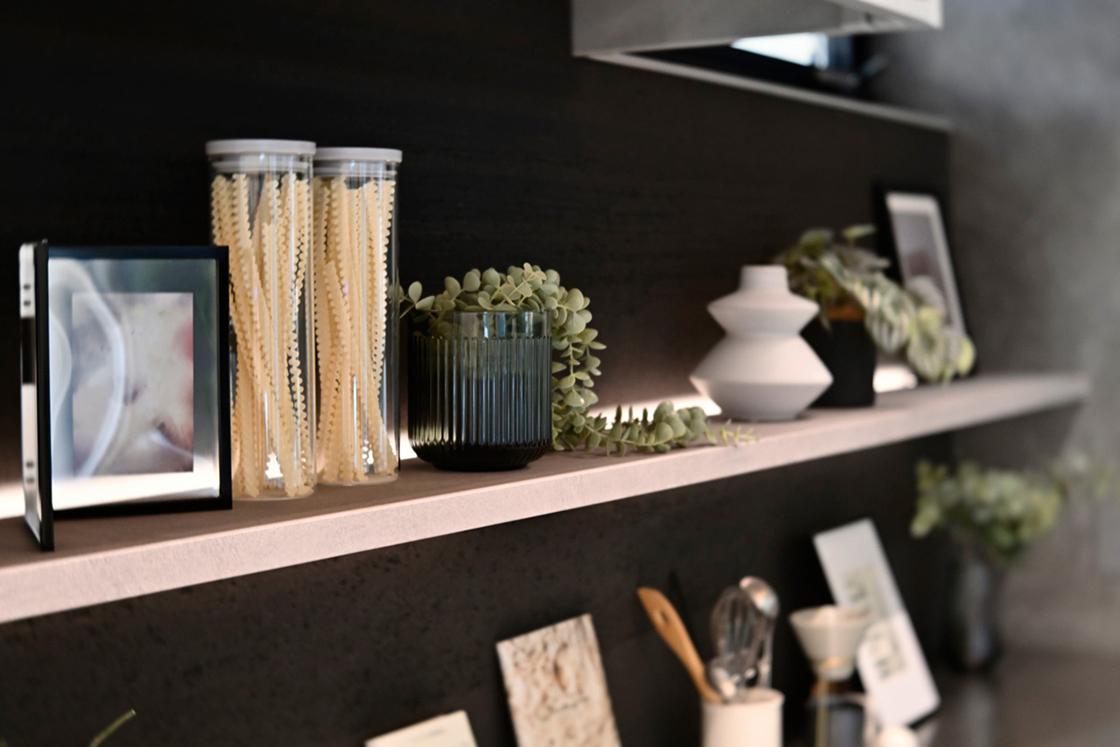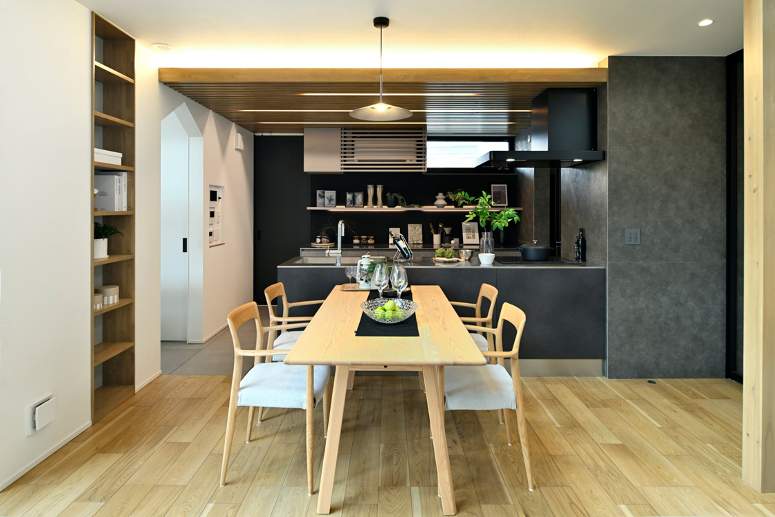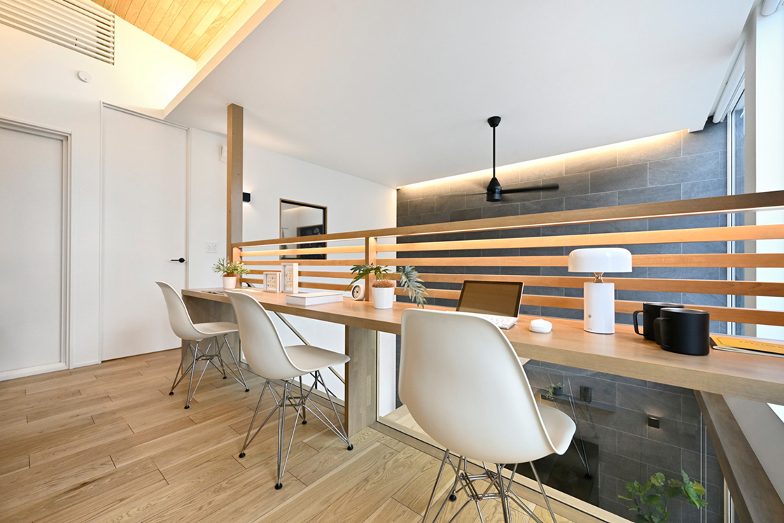 黒いスチールレッグのソファには、モノトーンのクッションをコーディネートし、ダイニングテーブルとチェアは、無垢材ながらあえて周囲とのバランスを考えて線の細いデザインをチョイス。ディスプレイも色は抑えながらも、大きさやフォルムのユニークさで、メリハリのある空間を演出しました。カウンターデスクやスタディコーナーには、緩やかなカーブを描くチェアを組み合わせて、リラックスしながら在宅ワークや勉強ができる空間をイメージしてつくりました。