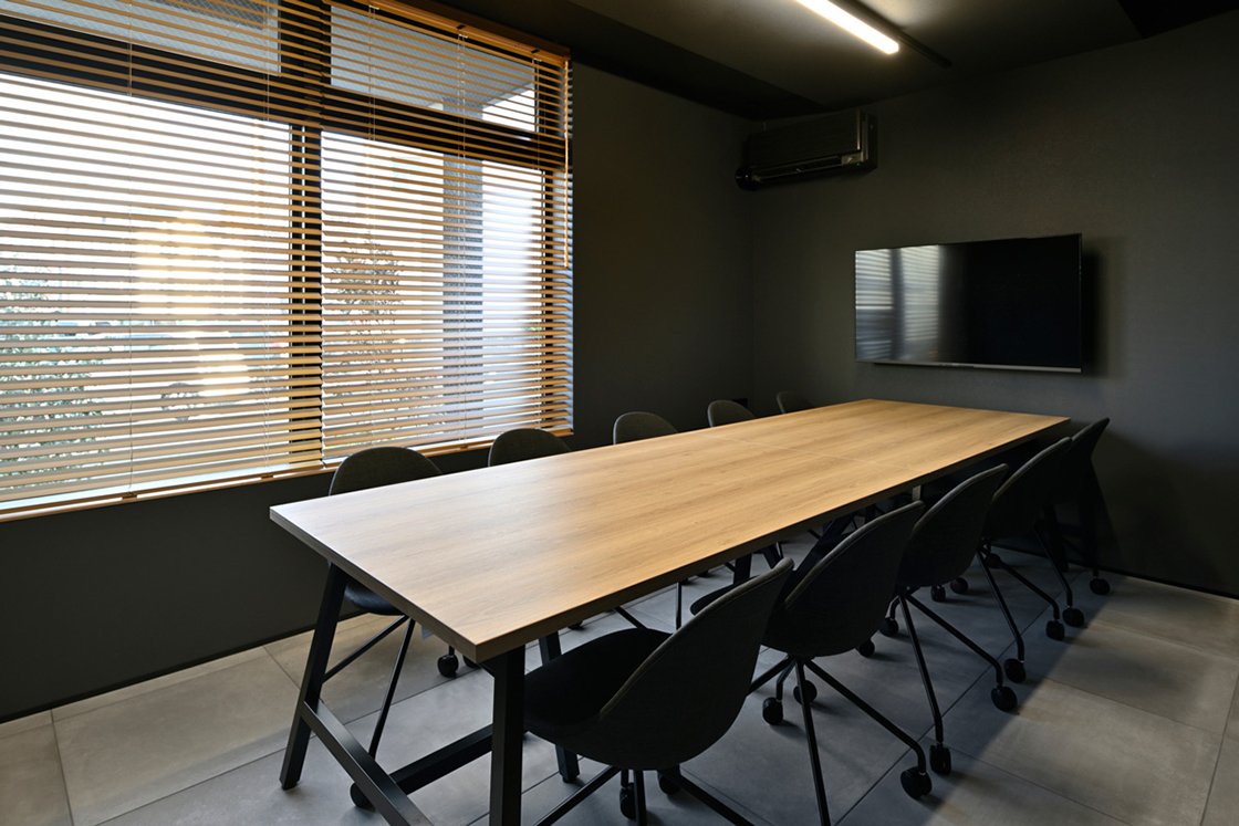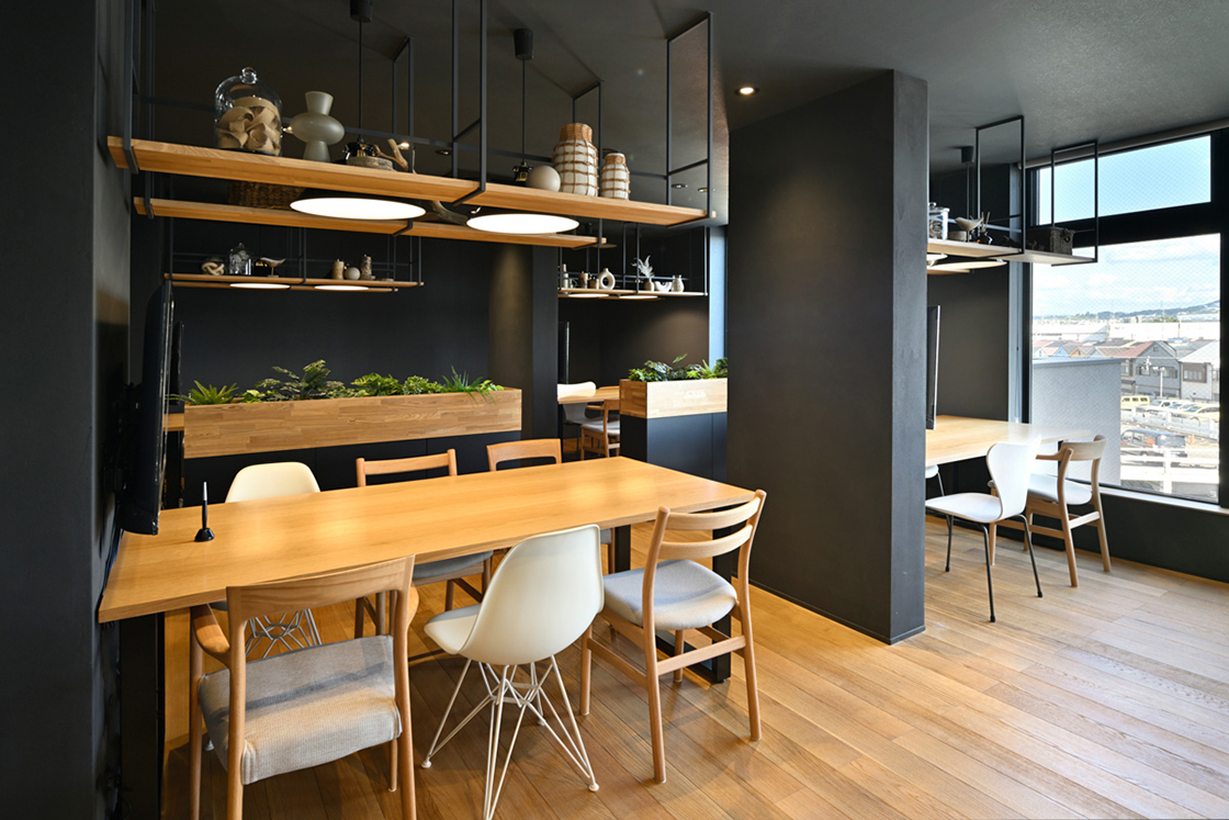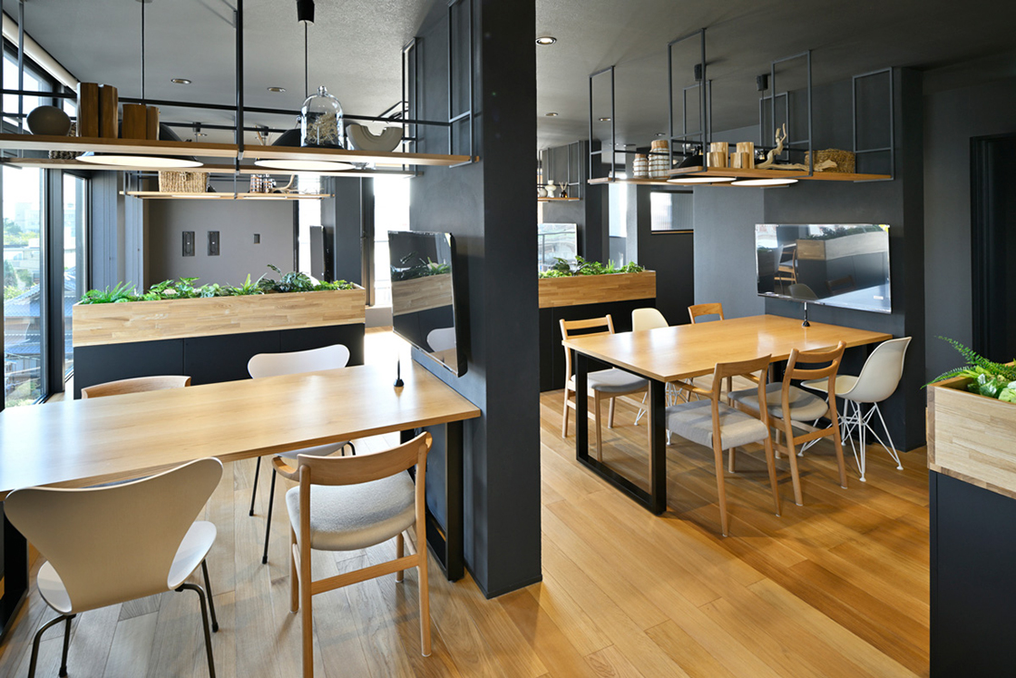 4階建ての純木造ビルは、住宅建材や設備、構造のショールームと、商談スペース、オフィスの機能を備え、「黒」を基調としたシックな雰囲気に仕上げられています。お客様が落ち着いて家づくりのお話ができるように、無垢材を使った柔らかいフォルムで、黒のカラートーンに合うキャスターチェアやテーブル、ディスプレイをご提案しました。 商談スペースには、個性豊かな5種類のチェアを組み合わせて、 飾り棚にはショーウインドウのように小物をディスプレイ。また、葉っぱの形が異なる6種類のフェイクグリーンを飾って、気持ちがいっそう和むように努めました。