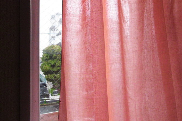 新色のPeachはコーラルピンクのような色合いで、14-23 multi cloth Tossの持つ素材の柔らかさがよく表現されています。単体だと少し合わせにくい印象を持たれるかもしれませんが、カーテンとしても、お部屋の間仕切りとしてパーテーション代わりに吊っても、想像以上に使いやすい色でした。
