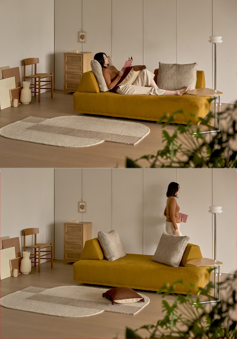 PLAYGROUNDの特徴は、何といっても背もたれもアームもない、フラットなデイベッド型であることです。背もたれとなるバックフォームクッションは自由に動かせるため、どの方向からでも座ることができて、さまざまなレイアウトに対応します。