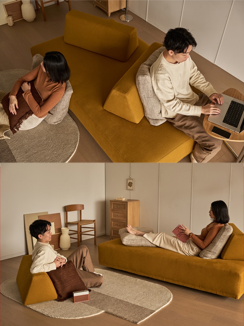 置く場所を選ばないPLAYGROUNDは、座る場所も自由で、360度どこからでも座れます。座る人数を限定しませんから、来客時には大勢で、一人の時にはカウチソファのように足を伸ばして、と状況に合わせて使うことができます。それぞれが好きな方向を向いてくつろげるので、テレビを見る人、スマホを見る人、昼寝をする人など、さまざまな過ごし方がPLAYGROUND1台でかないます。