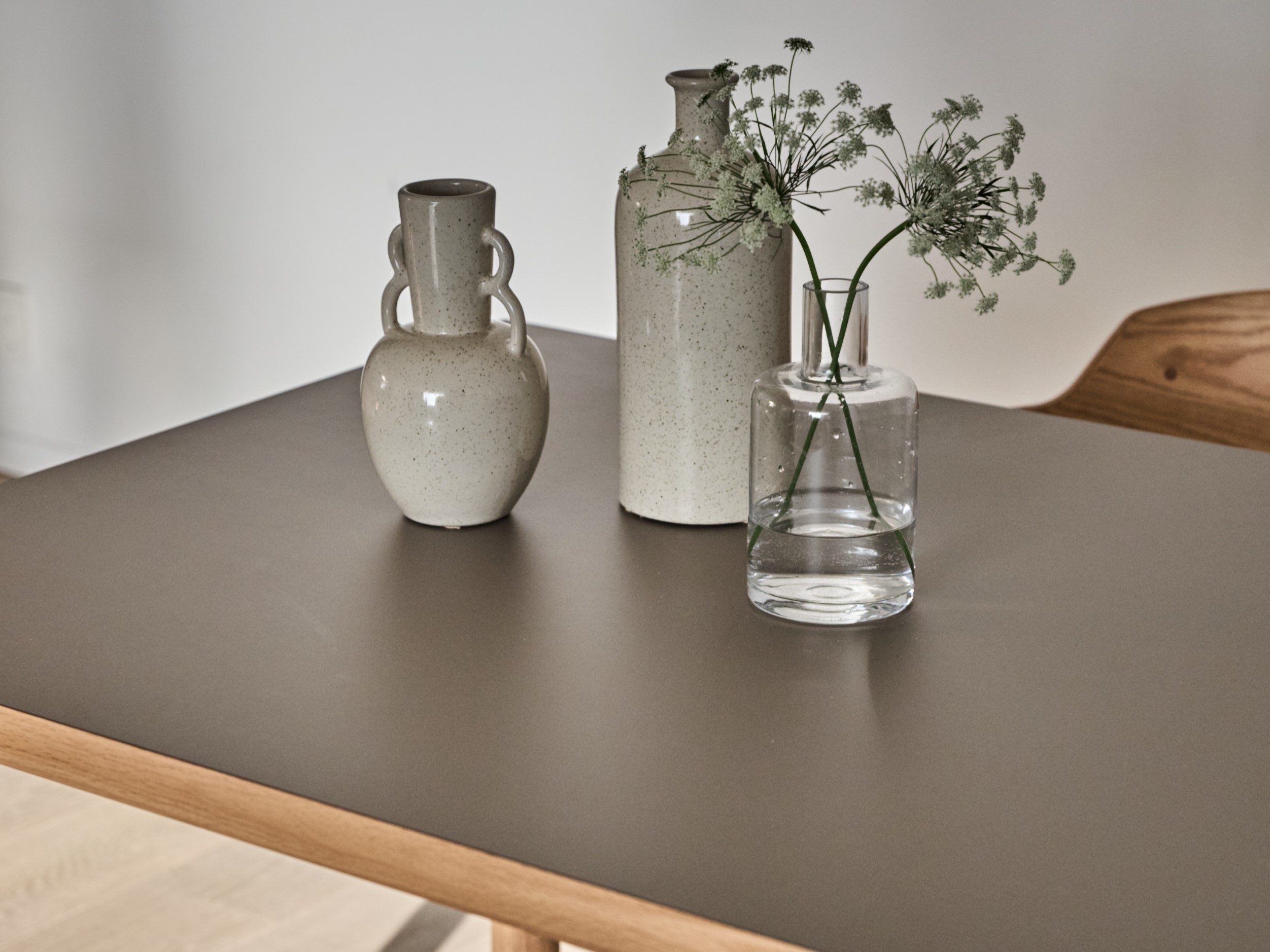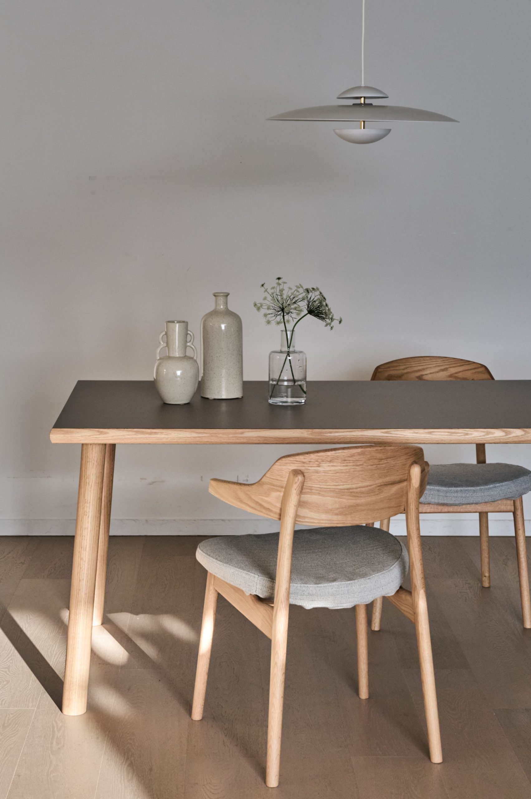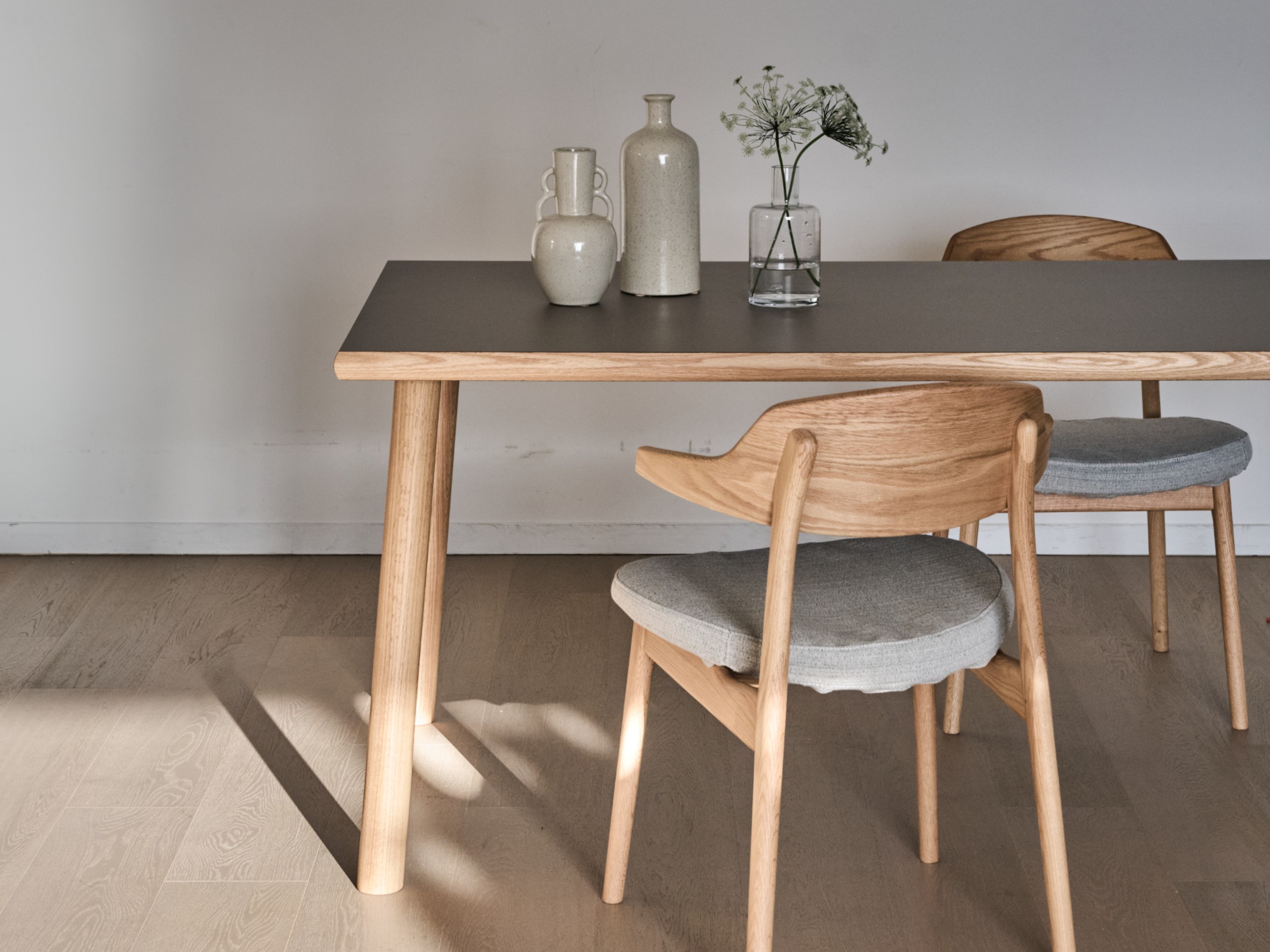 天板は角の丸みと真っすぐなラインのつながりが美しく、細やかなディテールがテーブルに穏やかな印象だけでなく、凛とした佇まいを与えています。