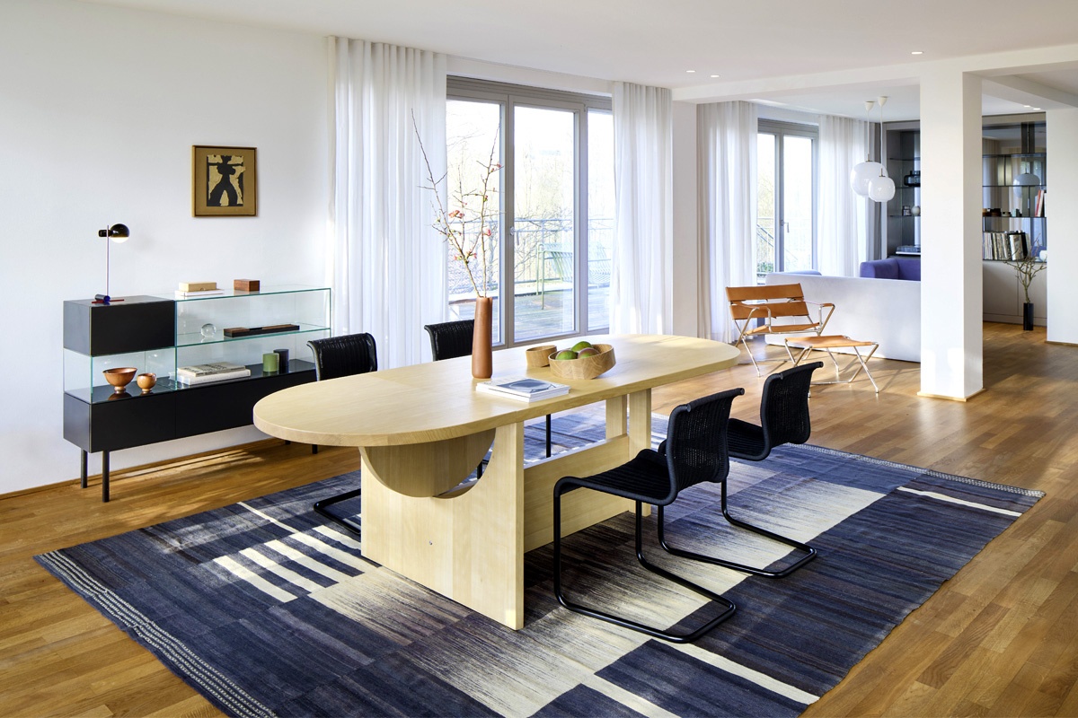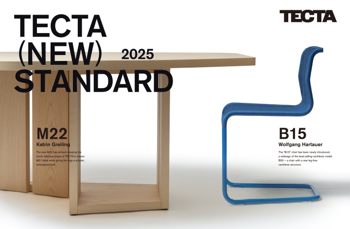 バウハウスの思想を継ぐTECTAが提案する「未来のスタンダード」として、新作の「M22」テーブル、「B15」チェアを中心に、伝統と革新が融合したデザインを展示中です。