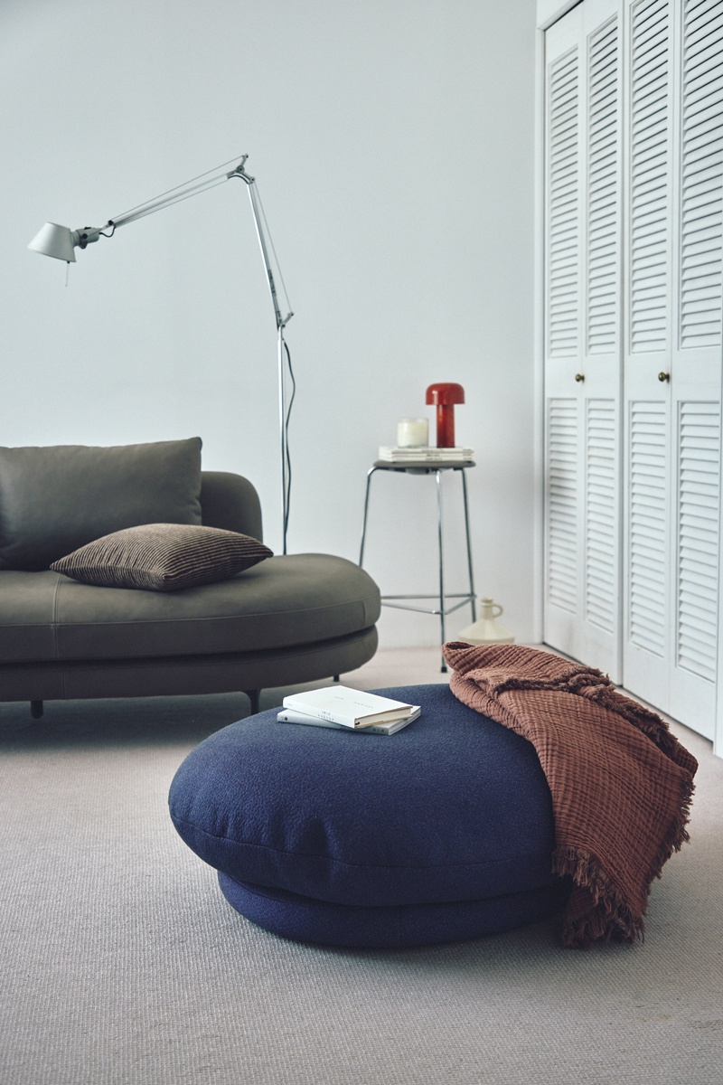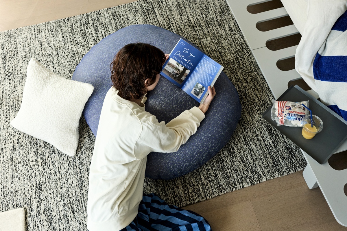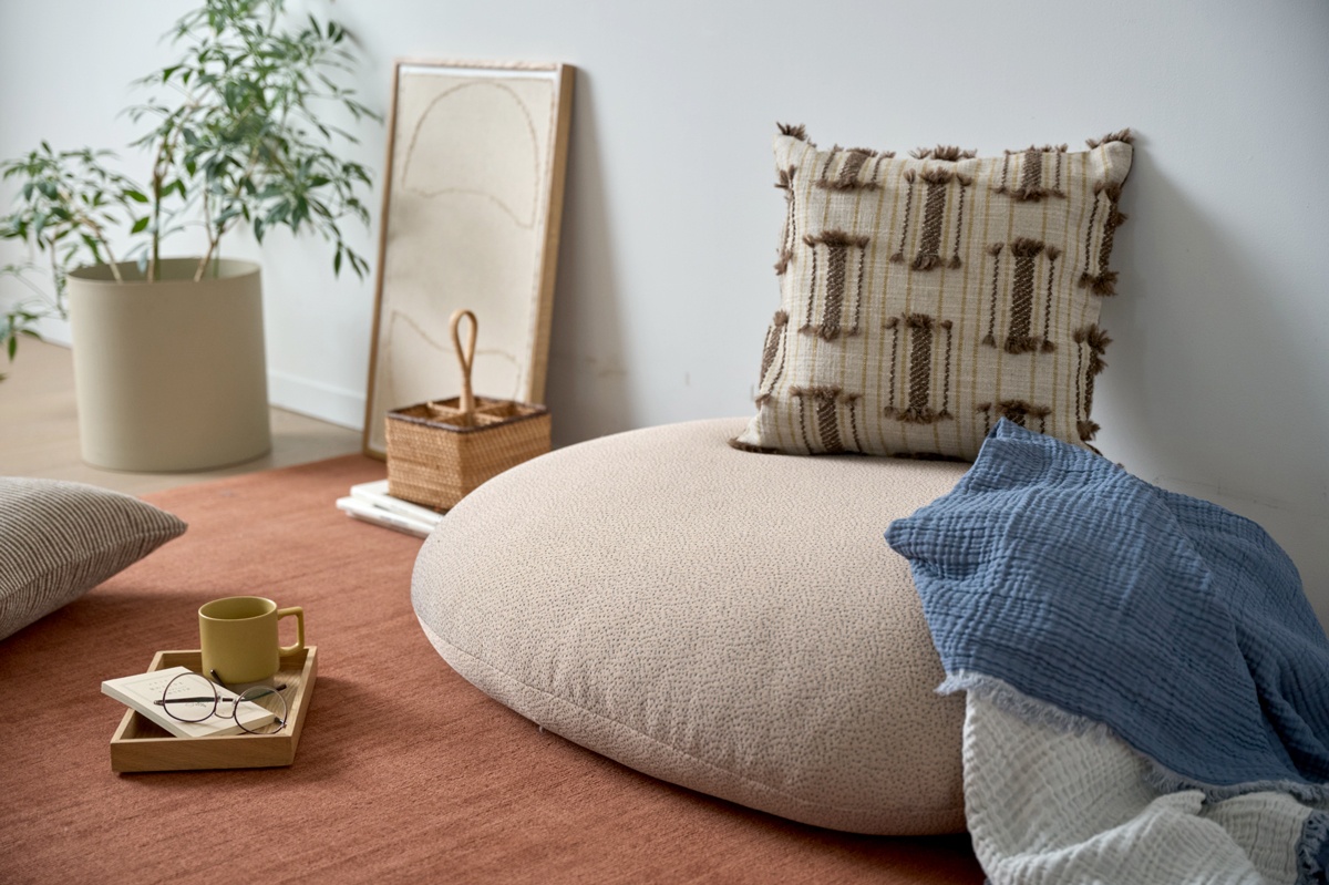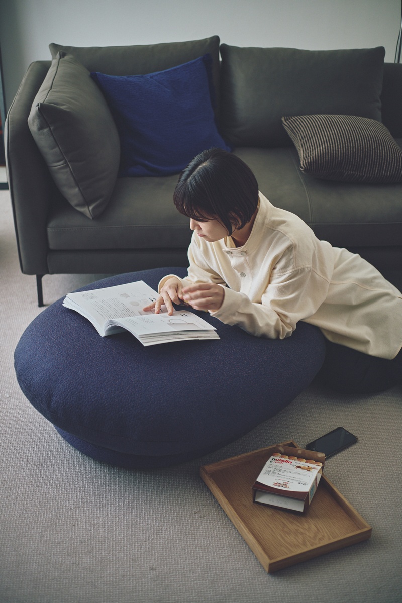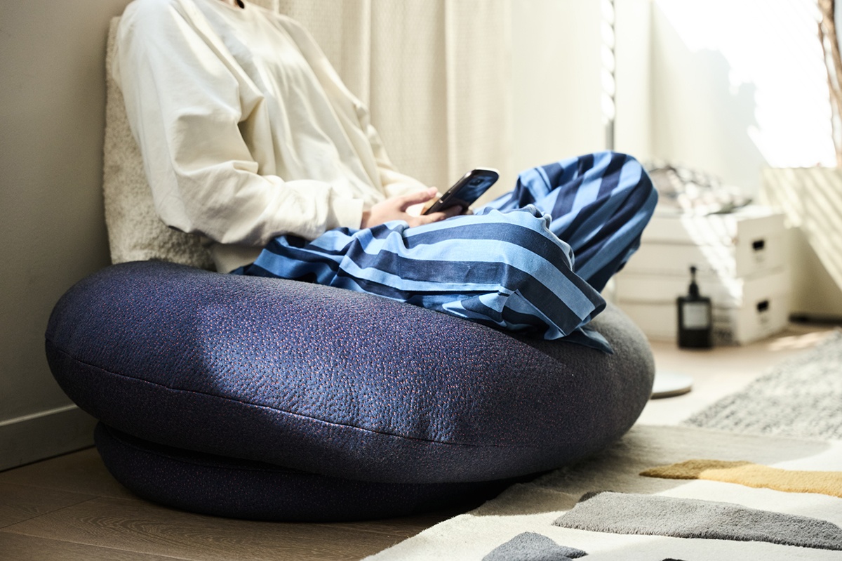 丸みを帯びた愛らしいフォルムは、モダンなインテリアにもよく合います。体が沈み込みすぎない安心感のある座り心地が、床で過ごすくつろぎの時間をより豊かに変えてくれます。一人暮らしのお部屋にも取り入れやすいサイズ感に加え、環境に配慮したアップサイクル素材を採用している点も、今の暮らしに寄り添うポイントです。