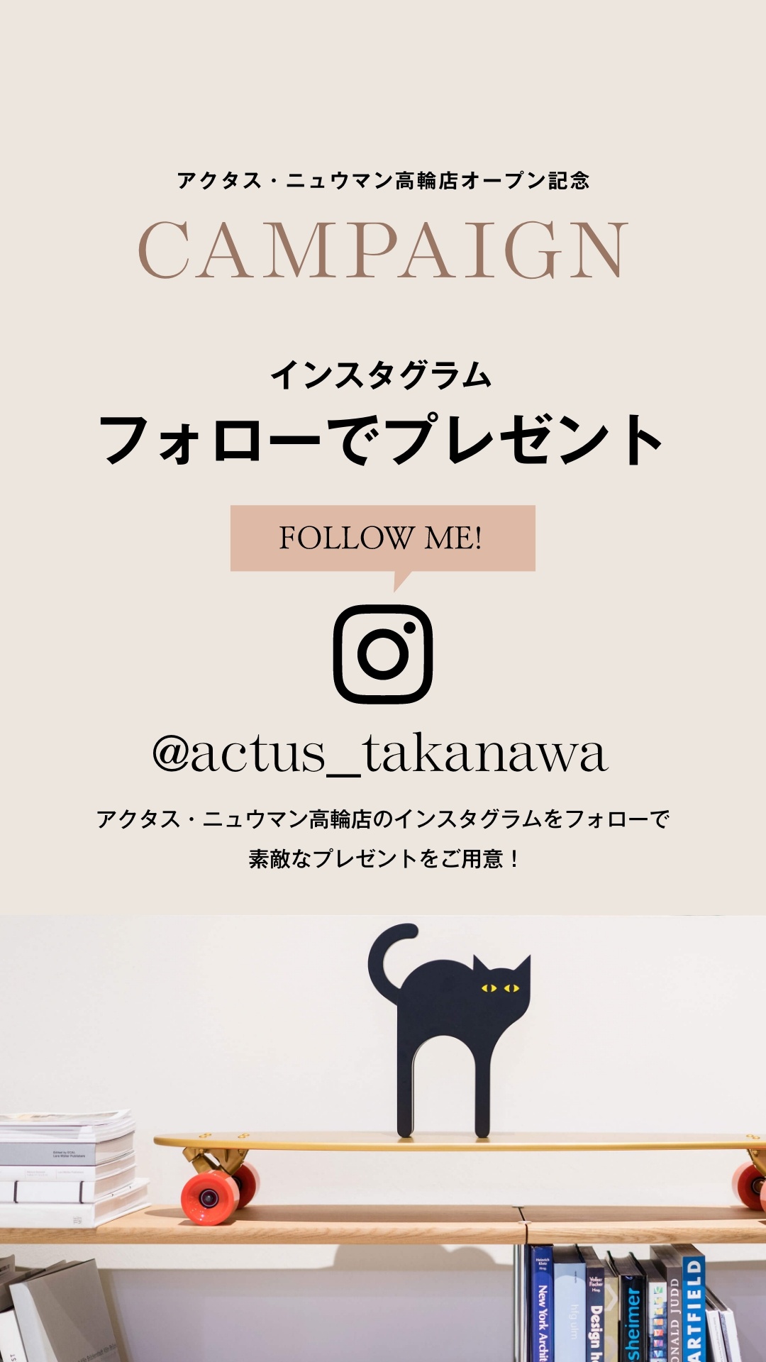 アクタス・ニュウマン高輪店のオープン記念として、Instagramのキャンペーンを開催いたします。9月30日(火)までの期間中に、アクタス・ニュウマン高輪店のインスタグラムアカウントをフォローいただいた方に、抽選でプレゼントを差し上げます。