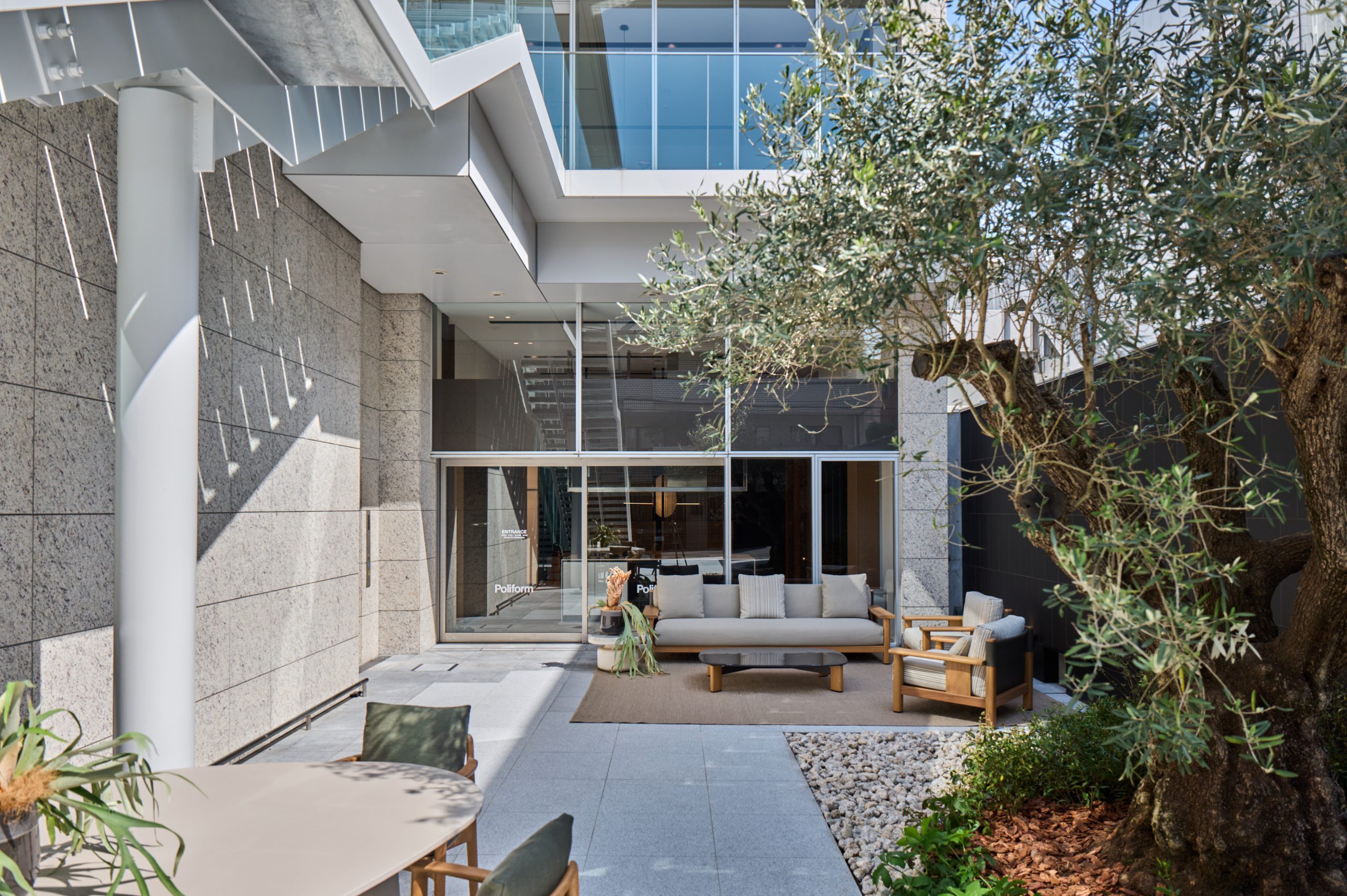 ストアのエントランスまでの回廊には、<Poliform>のインテリアをシームレスにつなぐアウトドアコレクションがお迎えします。