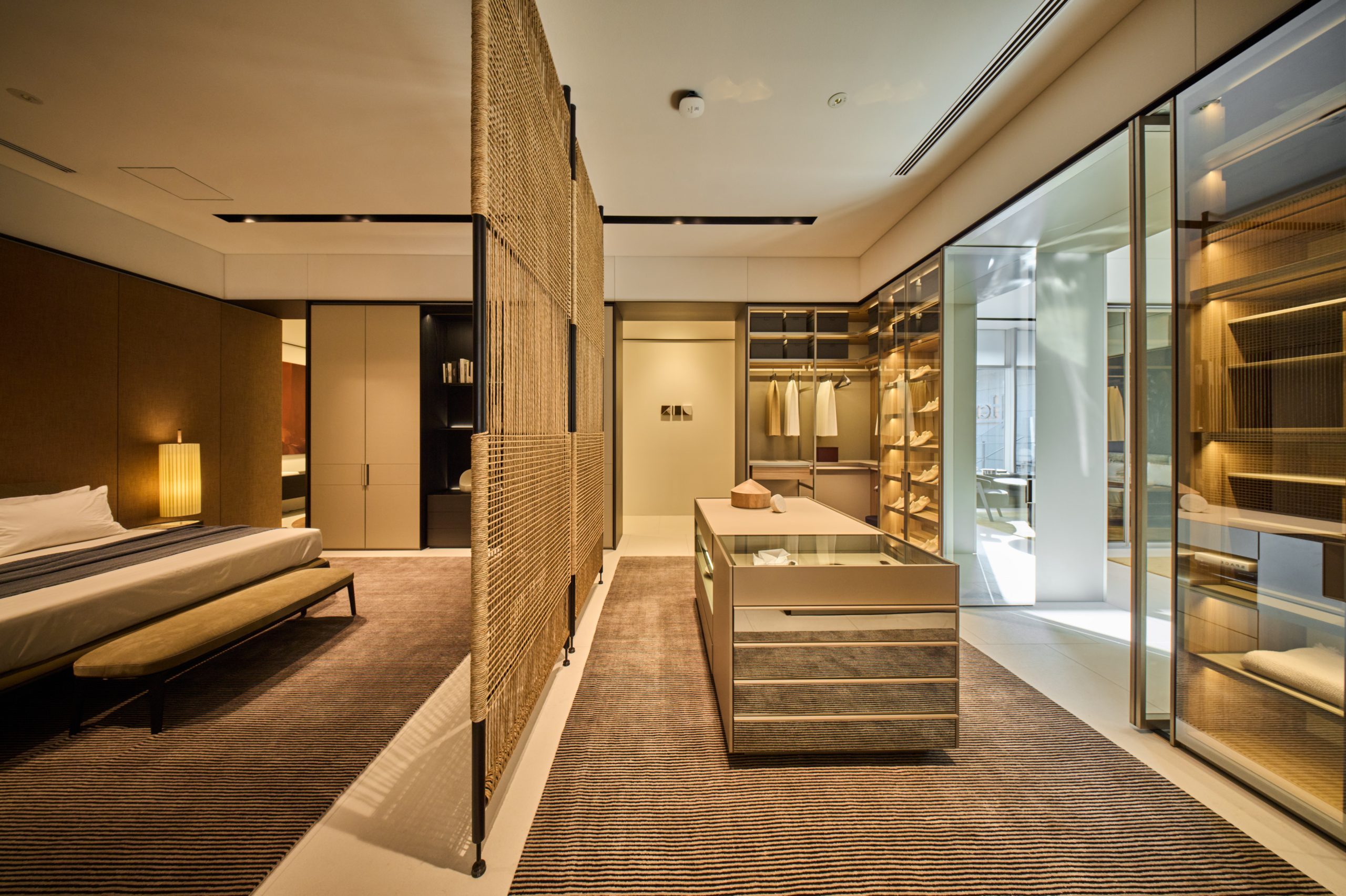 収納家具がブランドのルーツであることもあり、<Poliform>のシグニチャーであるシステム収納を数多く提案しています。衣類やパーソナルアイテムを機能的かつ美しく洗練された方法で収納できるよう設計された空間を体験出来ます。