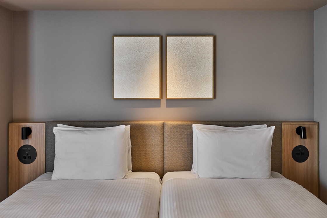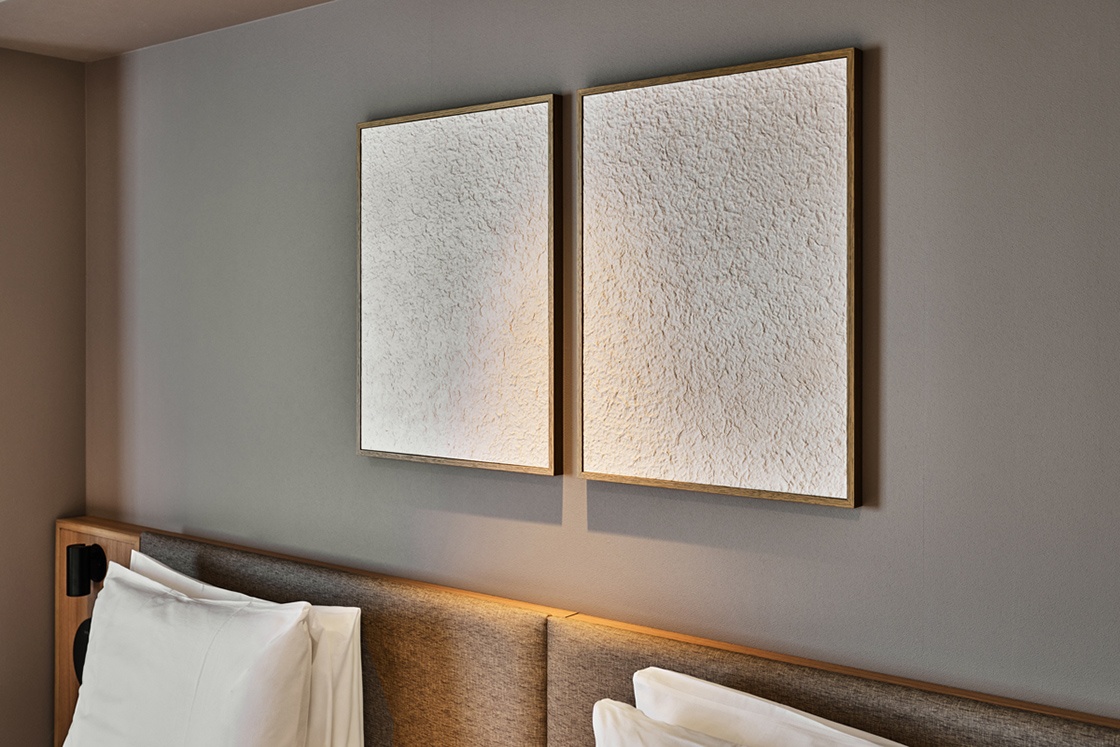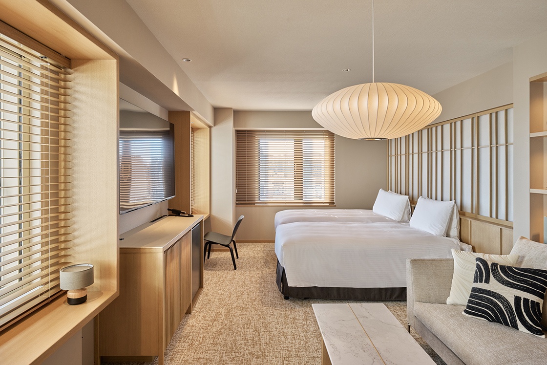 ダブルルーム2室を連結し、ソファでくつろげるゆとりある広さを備えたツインルームを新設しました。北欧のミニマルさと日本の静謐さを融合させて、空間を構成しています。