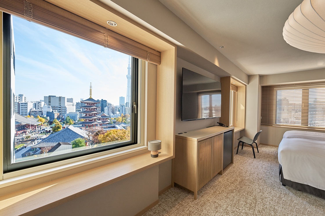 また、ベッドのヘッドボードには、日本古来のデザインである格子と障子をイメージし、優しい間接照明がリラックスできる空間を作り出します。テレビの下には茶器やお茶菓子をご用意し、工芸品に触れながらお茶を楽しむ体験をご提供いたします。7階以上の「プレシャスコンフォートツイン」は、浅草寺と五重塔、東京スカイツリー®を望む、浅草の借景を楽しめる特別な客室となっています。