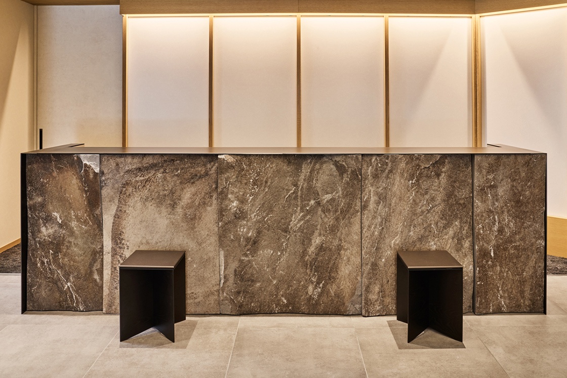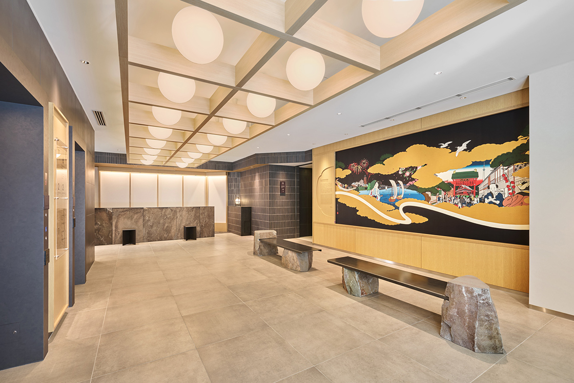 1階ロビーは、浅草の「今と昔」を重ね合わせた「OZ-尾頭-山口佳祐氏」の絵画を中心に構成。天井には浅草の灯り文化から着想した提灯格子を施し、柔らかい光でお客様をお迎えします。絵画前のベンチには、浅草の歴史的な建築にも用いられてきた神奈川県真鶴町産の小松石と、座面には黒皮風に仕上げた鋼材を採用。床はモルタル風タイルで仕上げました。木材と和紙、石と鉄といった異素材の対比によって、ほどよい陰影とエッジを加えています。