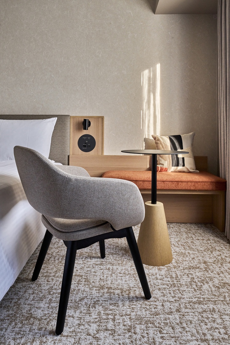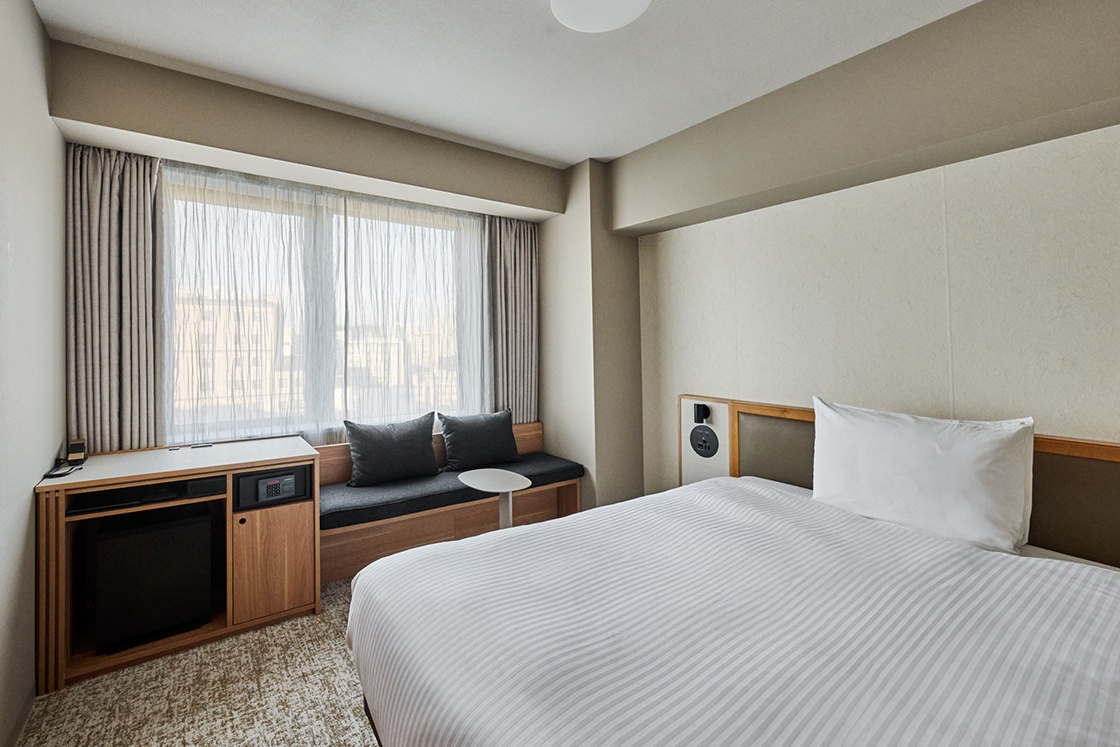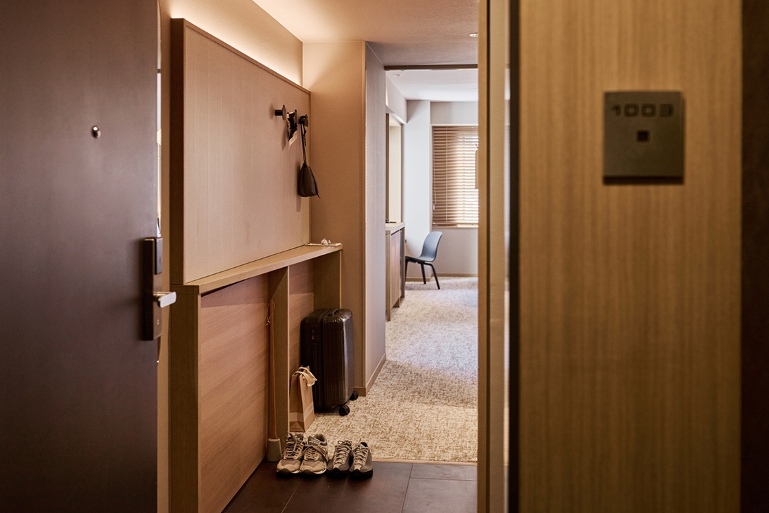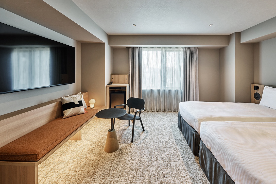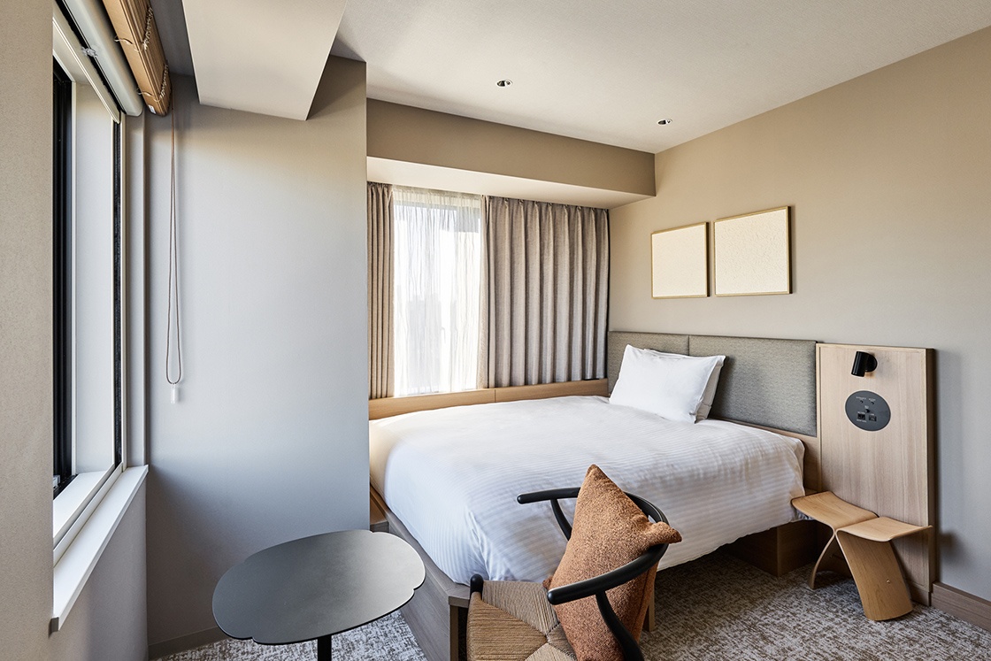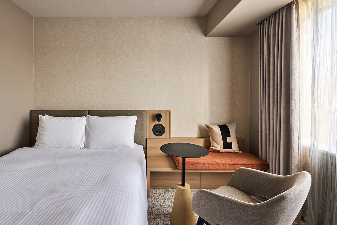 今回のリニューアルで客室(全128室)は、日本の伝統的な要素を取り入れながら、北欧らしいオーク材を基調としたデザインで、「和」と「北欧」が調和する洗練された空間に仕上げました。各客室にあったデスクを撤去し、代わりにベンチやソファを新設・配置。大型スーツケースで旅行する訪日外国人を想定し、収納スペースも確保することで、より広く快適にお過ごしいただけるよう配慮しています。