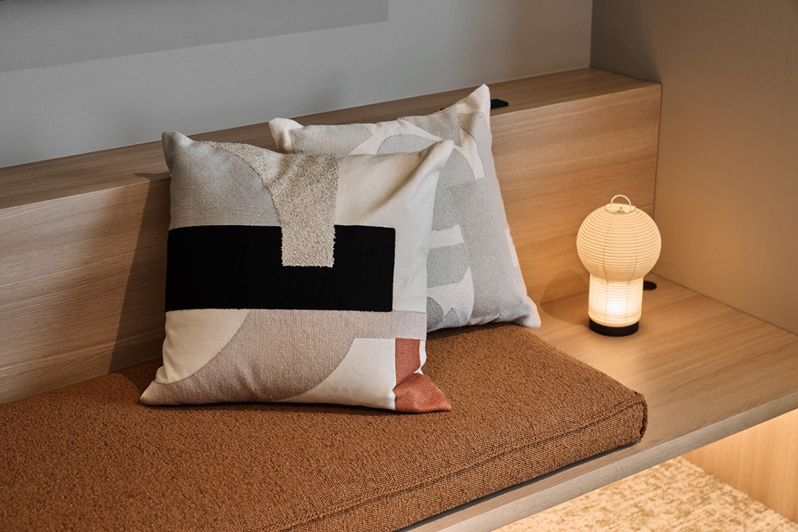 客室入口は、手前を靴脱ぎスペースとし、奥のカーペット敷きと素材を変えて、靴を脱いでくつろげるスタイルを提案。照明には、日本の繊細な職人のクラフトマンシップにも通じる、柔らかなフォルムと緻密なディテールが特徴のバブルペンダントを選びました。ペンダント下には、デンマークを代表するソファブランド「eilersen(アイラーセン)」のソファを配置し、北欧の静かな上質さを添えています。