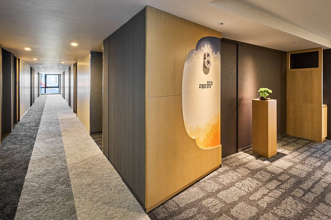 各階のエレベーターホールでは、1階ロビーで用いた小松石を階数表示に採用しています。背景には、ロビーの絵画で使われている「一文字ぼかし」を取り入れ、ロビーの世界観と連動した、落ち着きのある空間を演出。床には浅草の石畳を想起させるカーペットを敷き込みました。客室へ続く廊下のカーペットは、浅草の路地の記憶が動線の中に溶け込むようなデザインとしています。