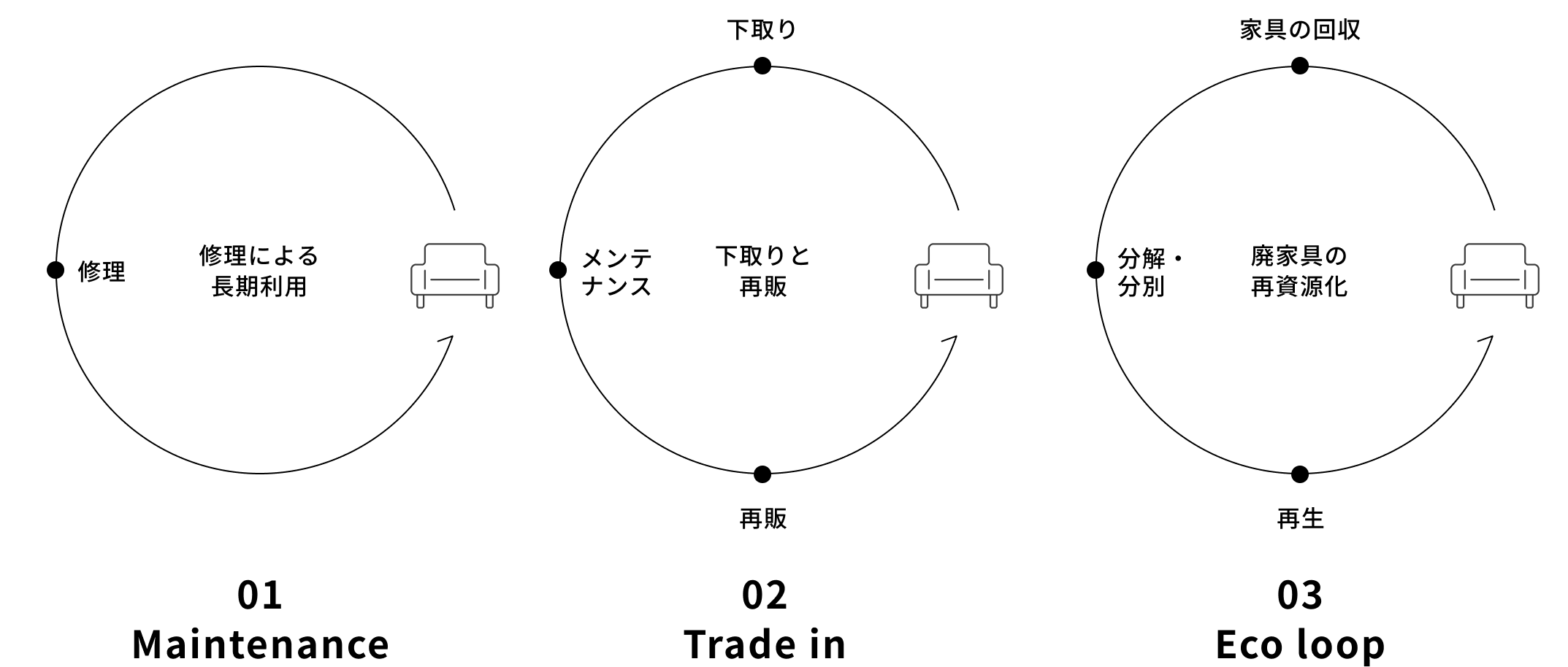 それは、1) 家具をずっと使い続けるための修理やメンテナンスサービス。2) ご家族構成の変化やお引越しなどでやむなく家具を手放される際の下取りによるサポート。3)古くなったり壊れてしまった家具の100%リサイクルです。特に木の部分は再び家具の材料に再生されるルートを構築しています。愛されてきた家具を無駄にはしません。